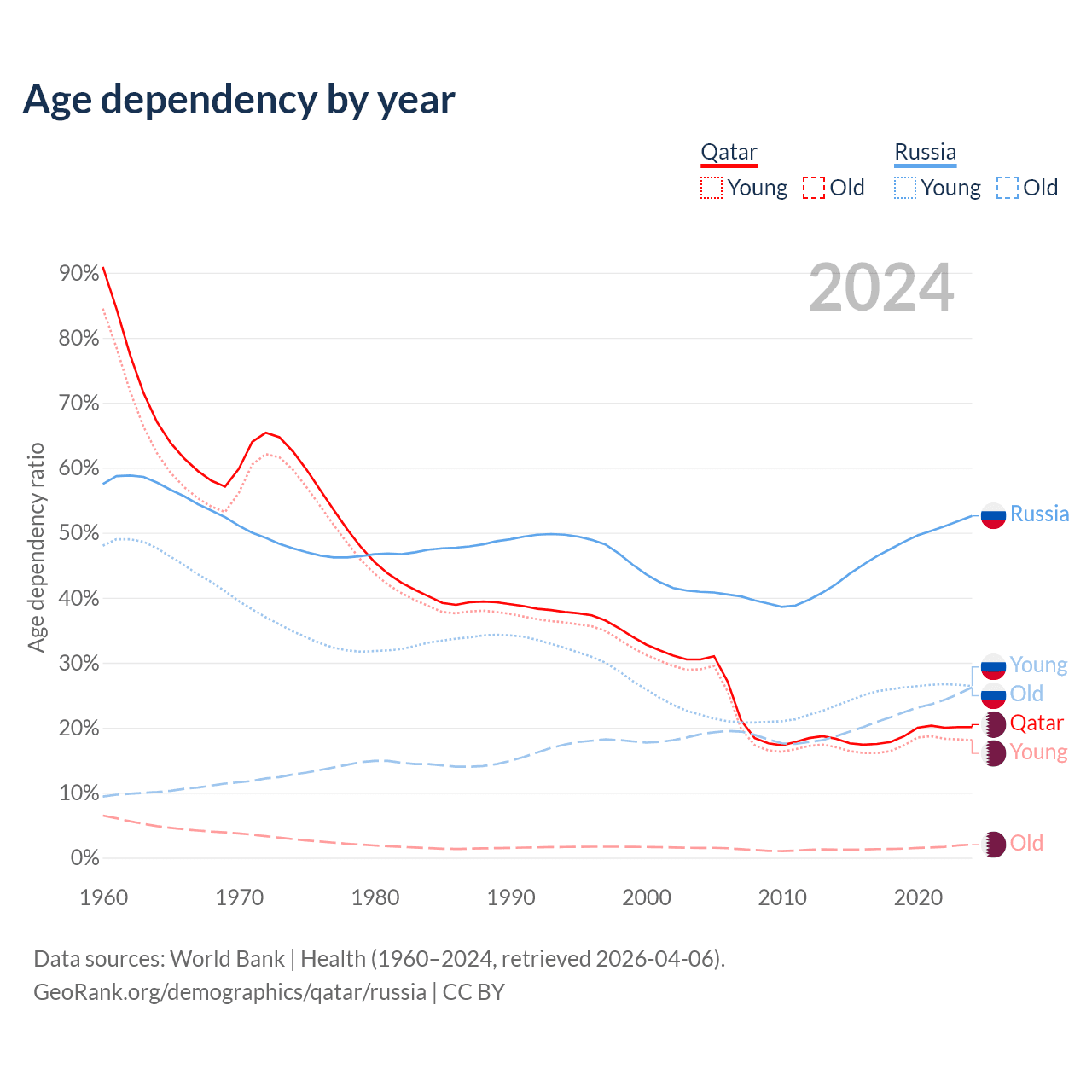 - Qatar is ranked 78/196 by median age (oldest to youngest) vs 42/196 for Russia.