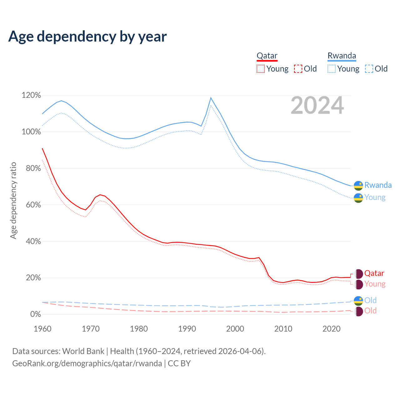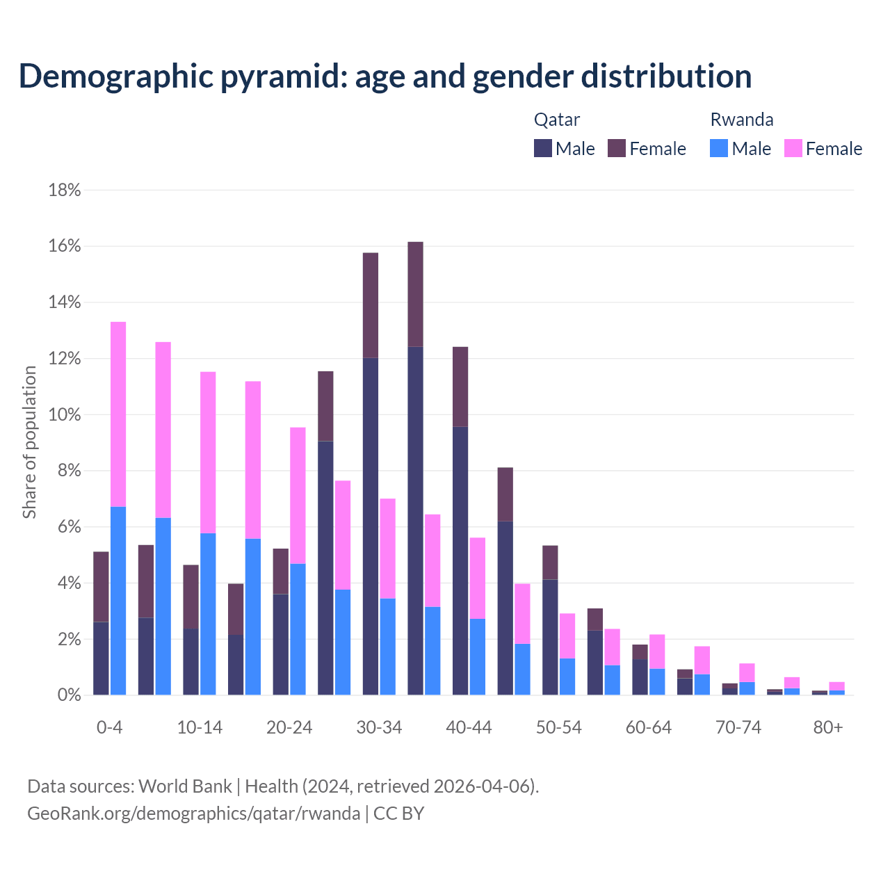 - Qatar is ranked 78/196 by median age (oldest to youngest) vs 160/196 for Rwanda.