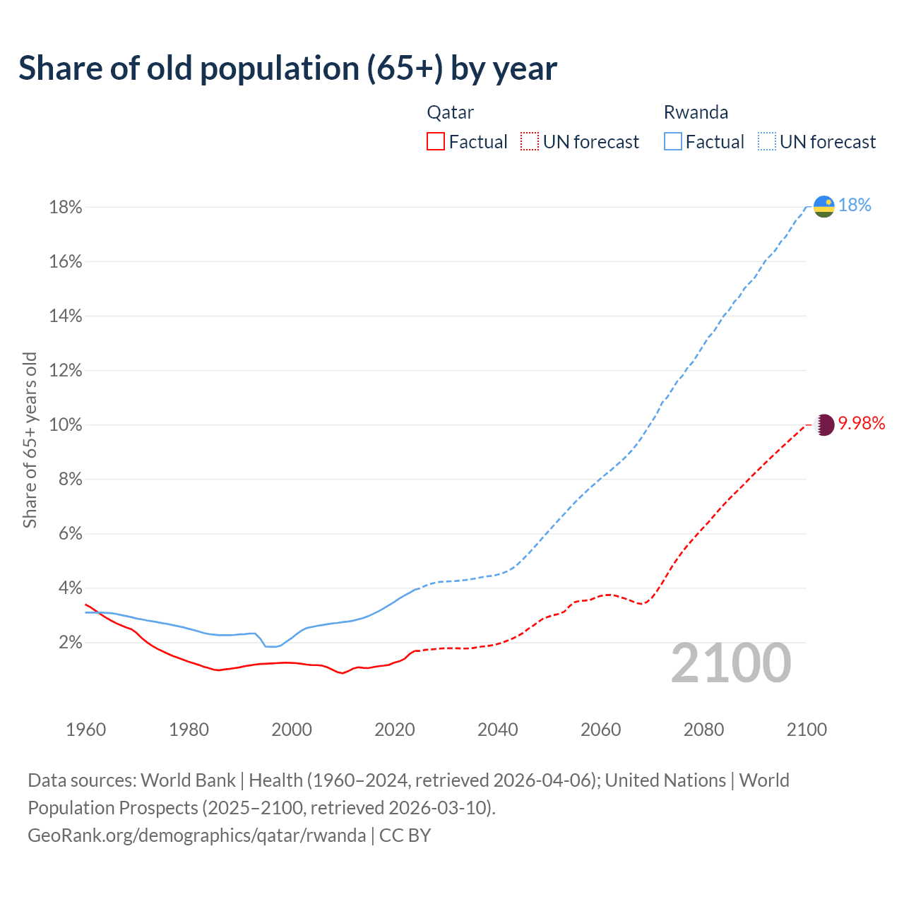 The share of older people aged 65 and over is 1.68% in Qatar and 3.93% in Rwanda. Life expectancy in Qatar compared to Rwanda .