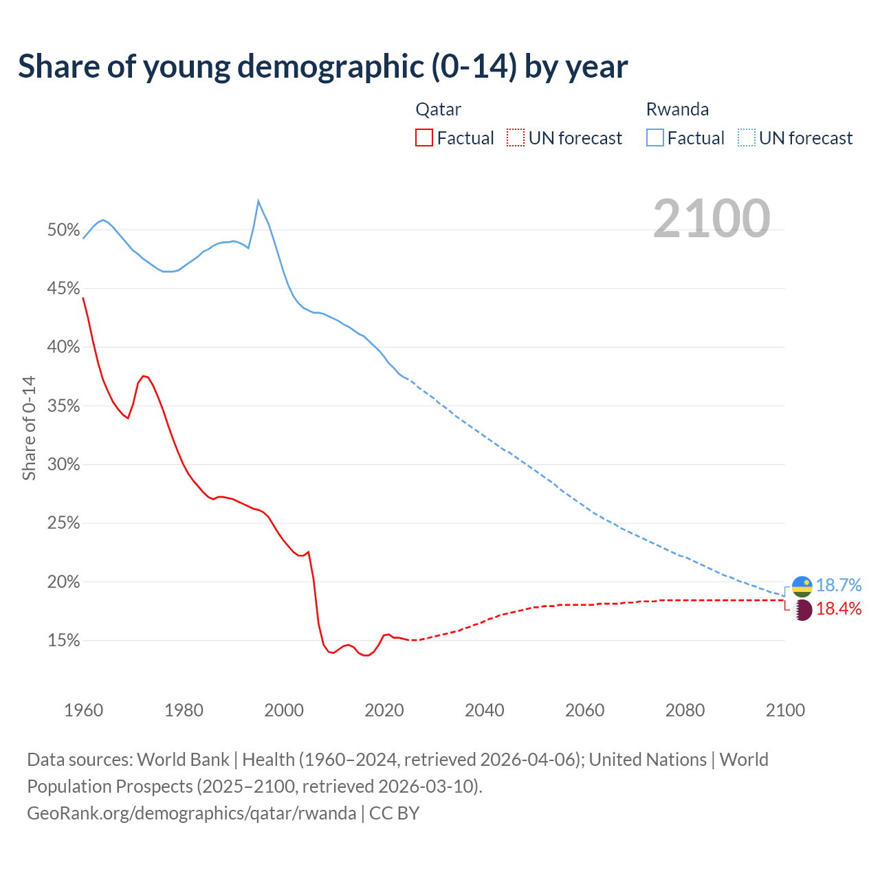 - The share of young demographic (0-15 years old) in Qatar is 15.1% vs 37.4% in Rwanda.