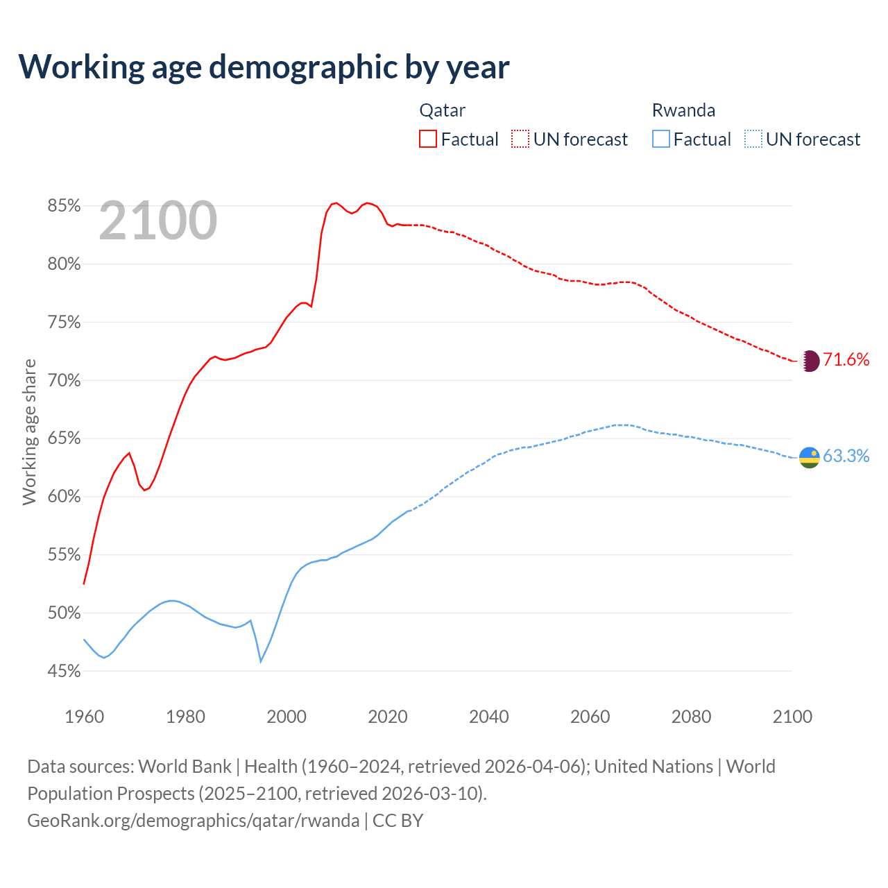 - Qatar has 2.5M working age adults (aged 15-64) vs 8.79M in Rwanda.