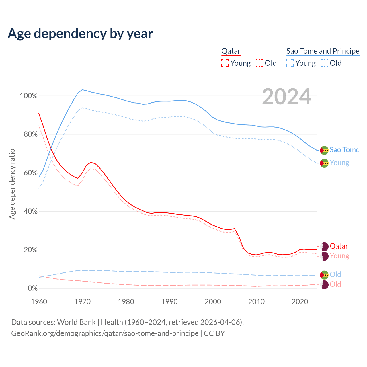 - Qatar is ranked 78/196 by median age (oldest to youngest) vs 163/196 for Sao Tome and Principe.