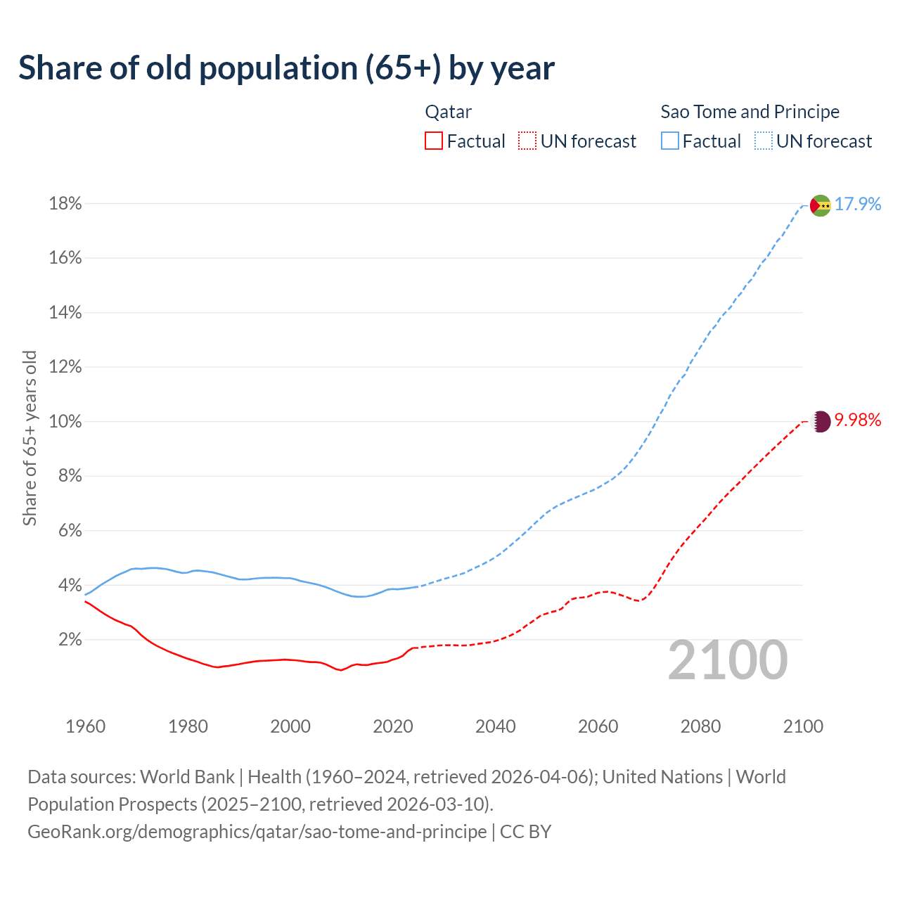 The share of older people aged 65 and over is 1.68% in Qatar and 3.9% in Sao Tome and Principe. Life expectancy in Qatar compared to Sao Tome and Principe .