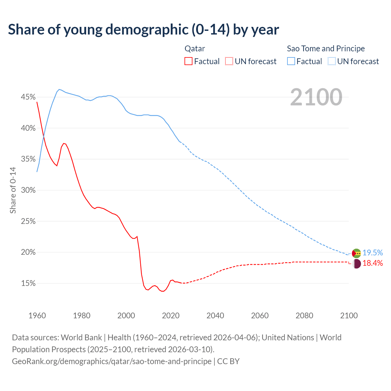 - The share of young demographic (0-15 years old) in Qatar is 15.1% vs 37.8% in Sao Tome and Principe.