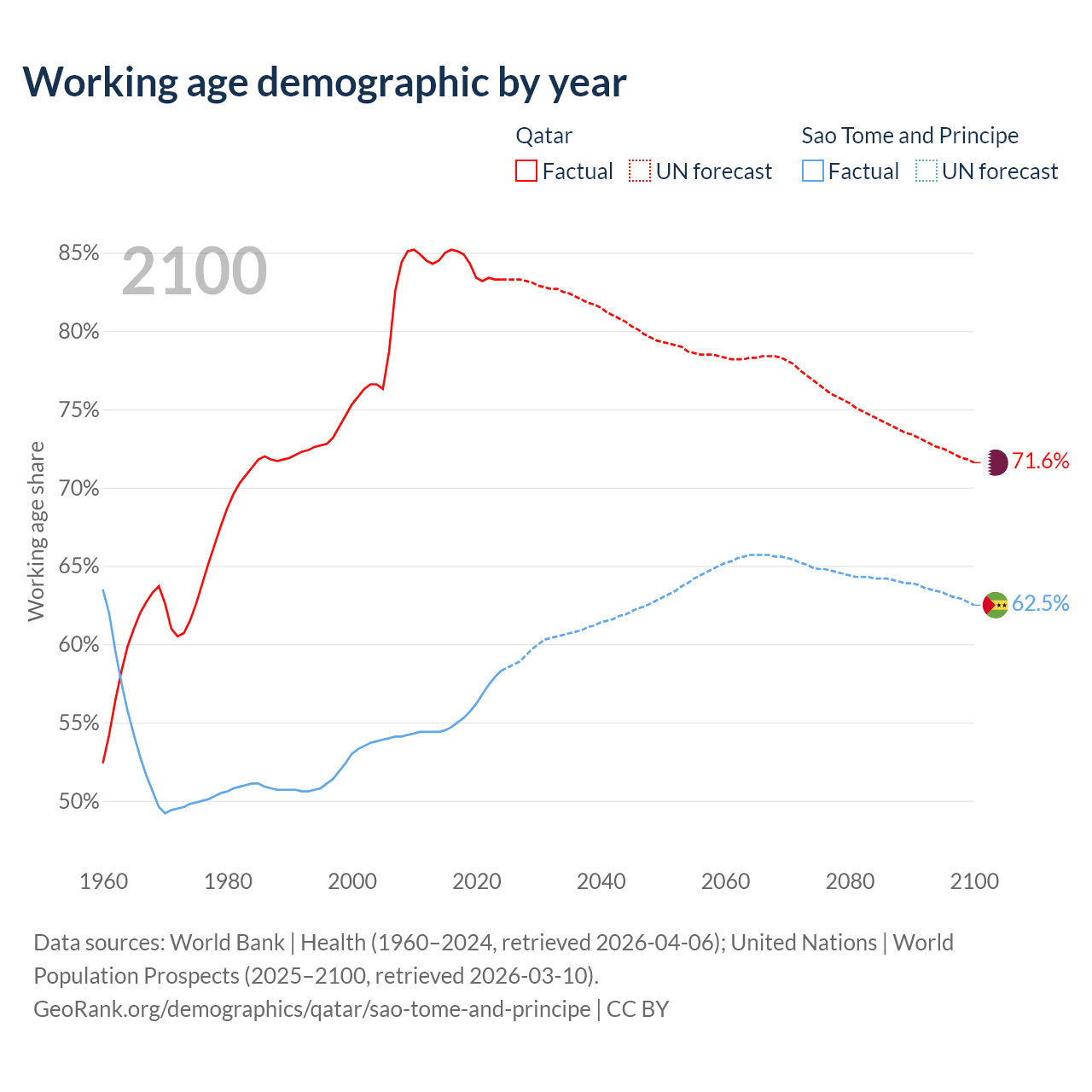 Median age Qatar vs Sao Tome and Principe, 1960-2100