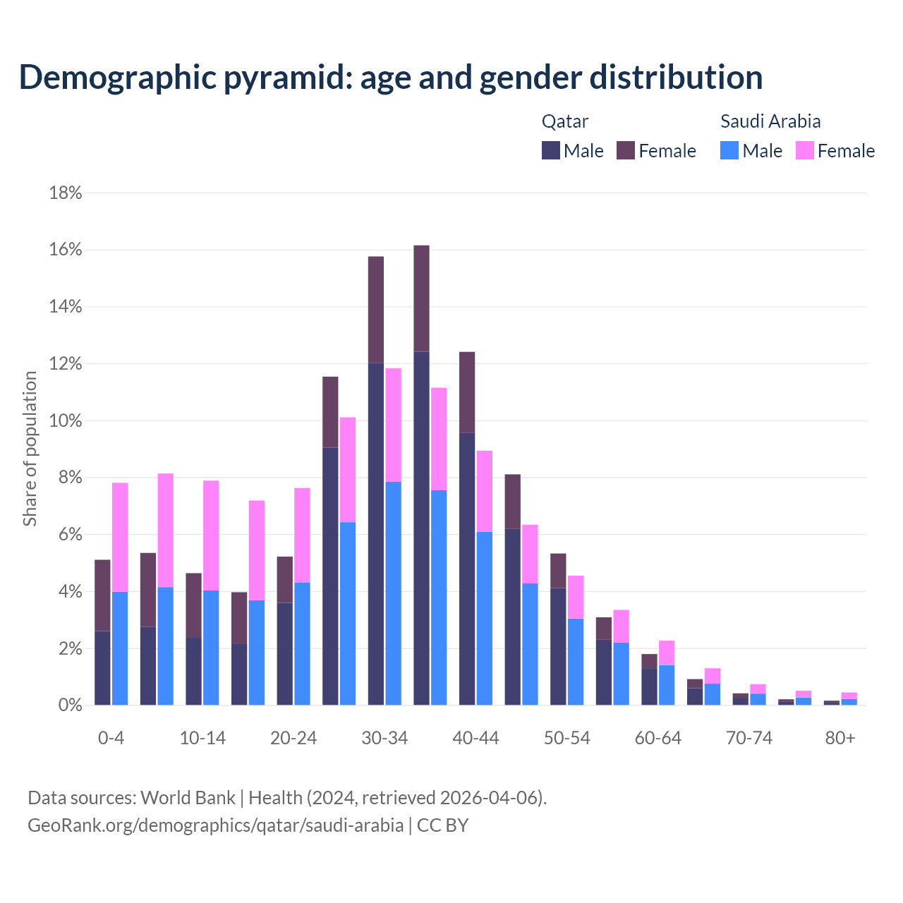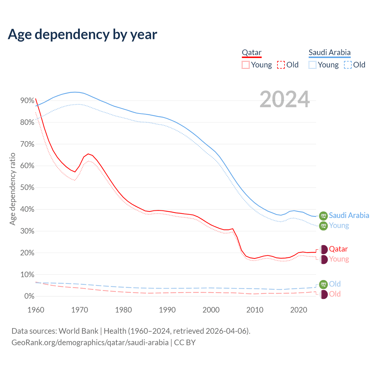 - Qatar is ranked 78/196 by median age (oldest to youngest) vs 98/196 for Saudi Arabia.