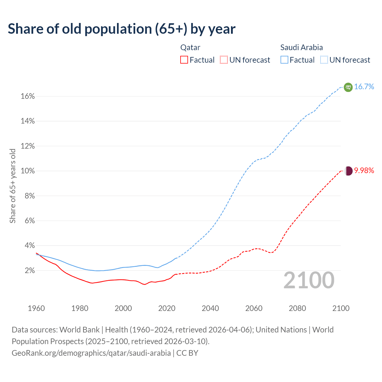 The share of older people aged 65 and over is 1.68% in Qatar and 2.95% in Saudi Arabia. Life expectancy in Qatar compared to Saudi Arabia .