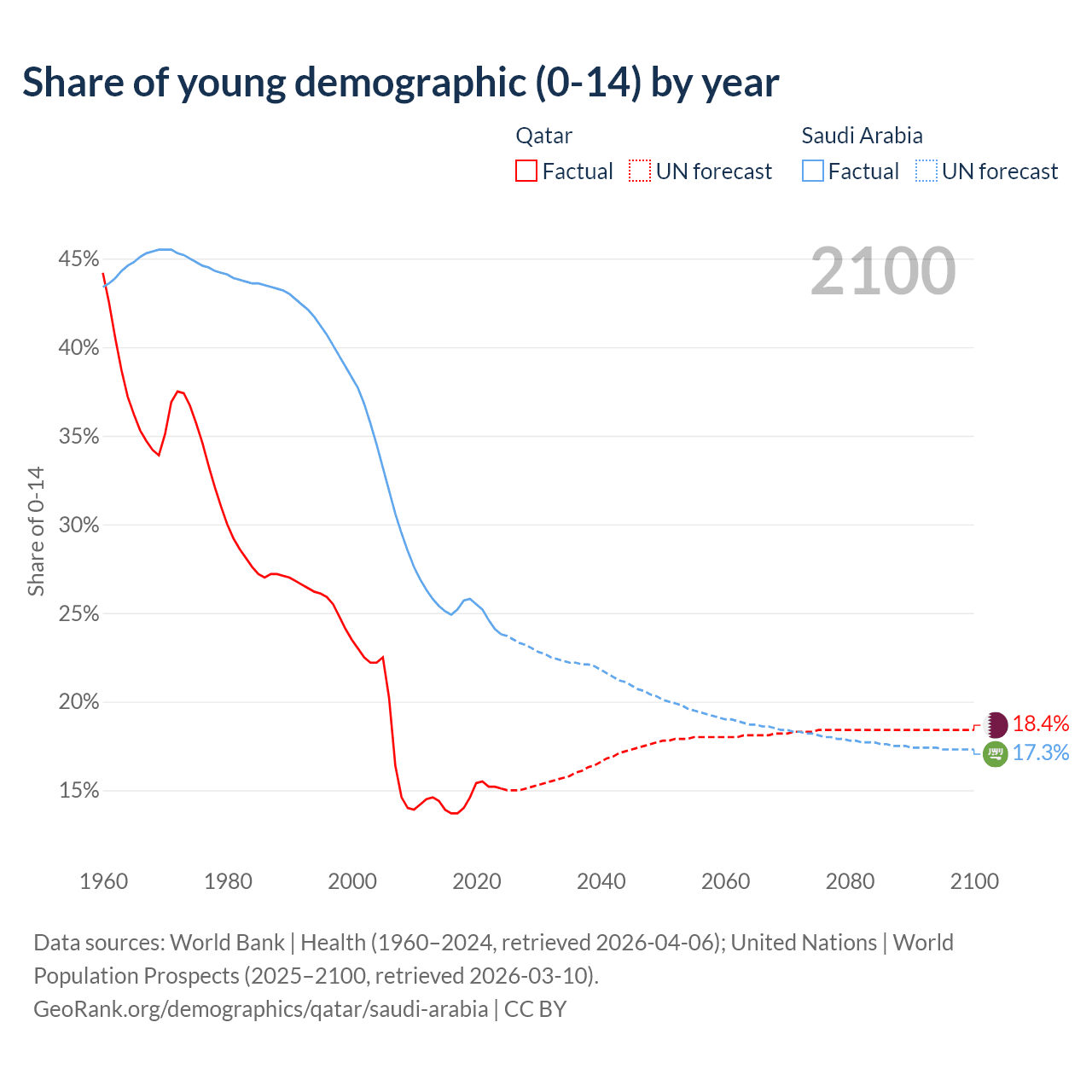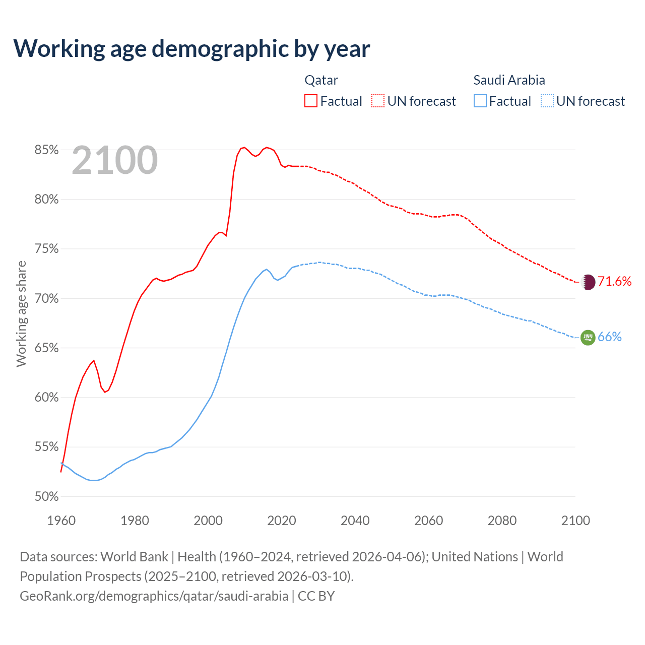 Median age Qatar vs Saudi Arabia, 1960-2100