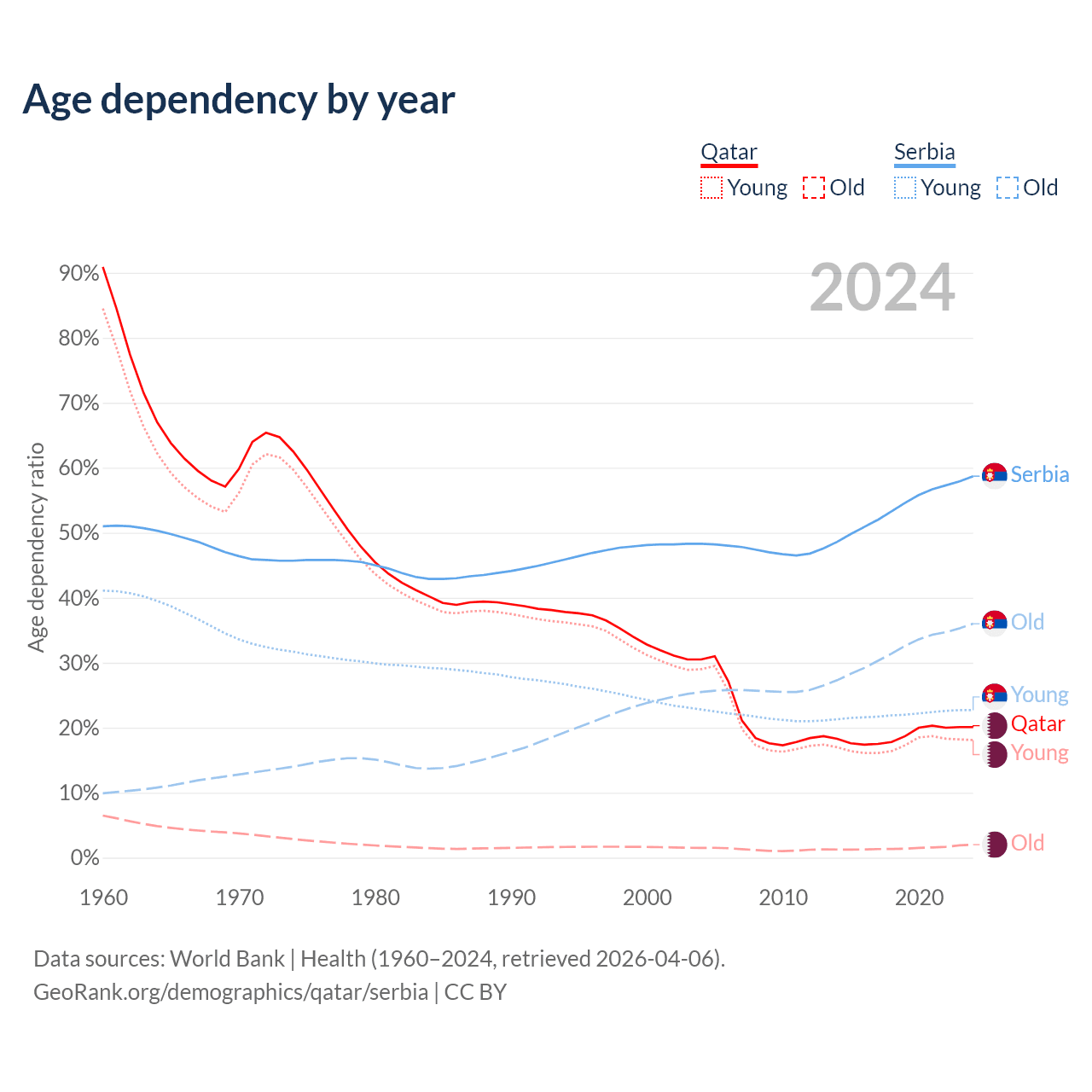 - Qatar is ranked 78/196 by median age (oldest to youngest) vs 15/196 for Serbia.
