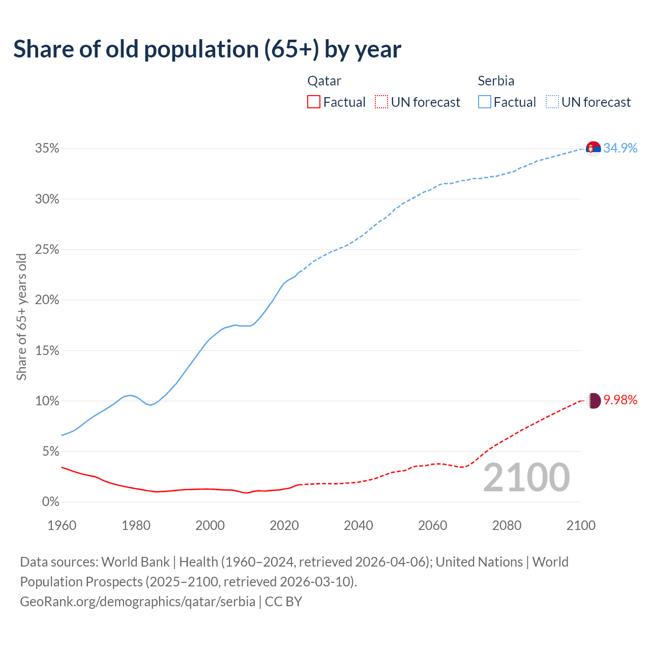 The share of older people aged 65 and over is 1.68% in Qatar and 22.7% in Serbia. Life expectancy in Qatar compared to Serbia .