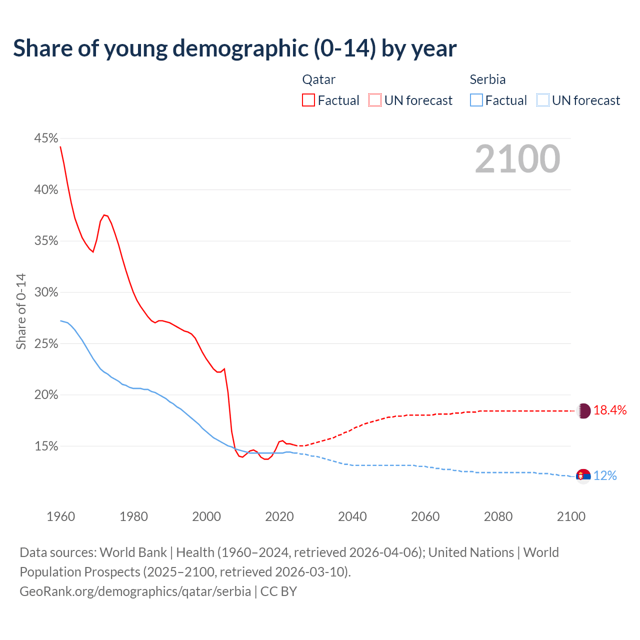 - The share of young demographic (0-15 years old) in Qatar is 15.1% vs 14.3% in Serbia.