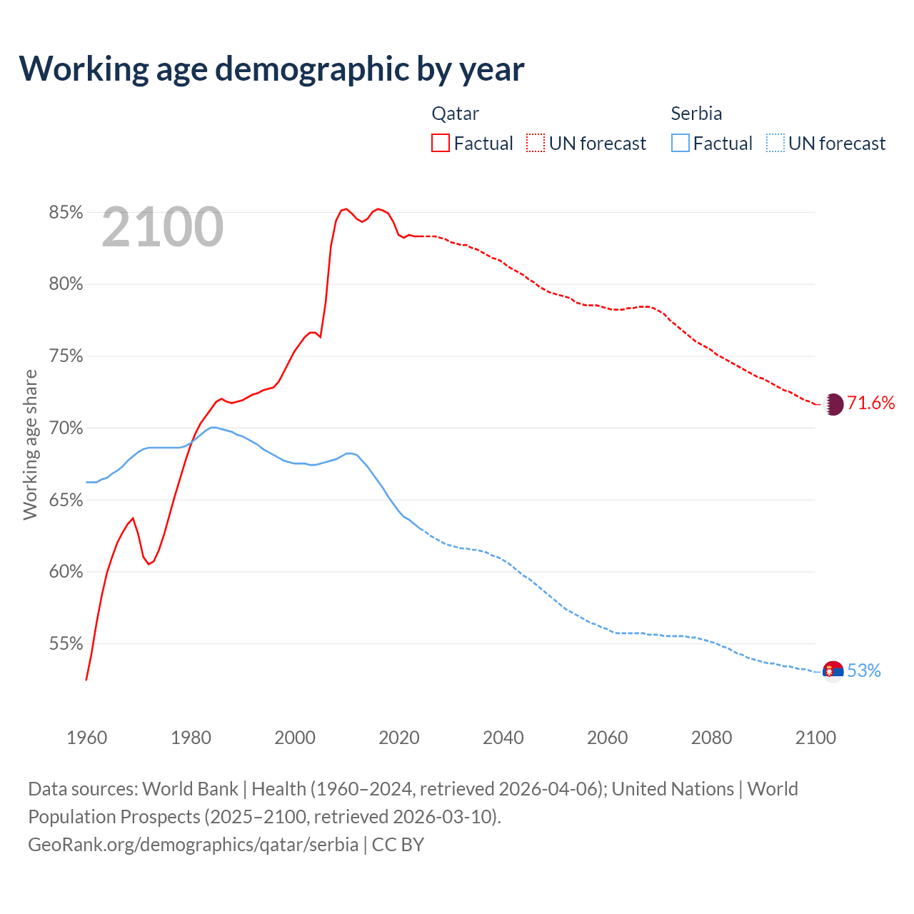 - Qatar has 2.5M working age adults (aged 15-64) vs 4.09M in Serbia.