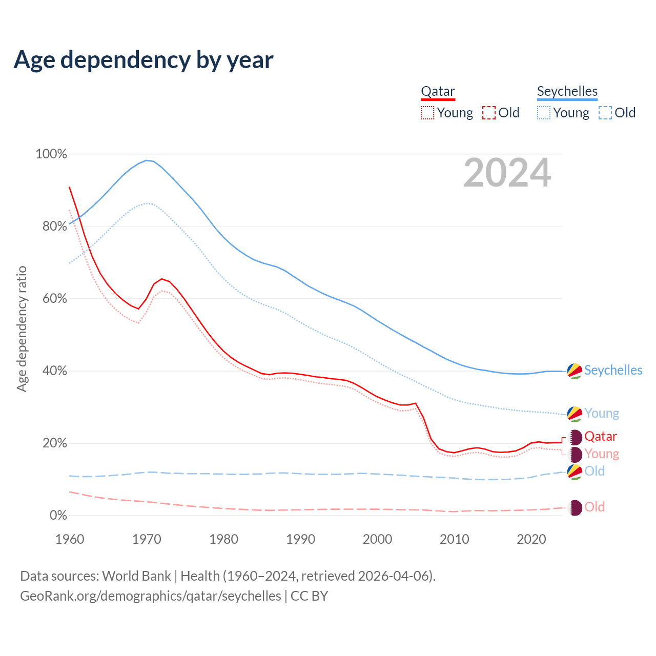 - Qatar is ranked 78/196 by median age (oldest to youngest) vs 76/196 for the Seychelles.