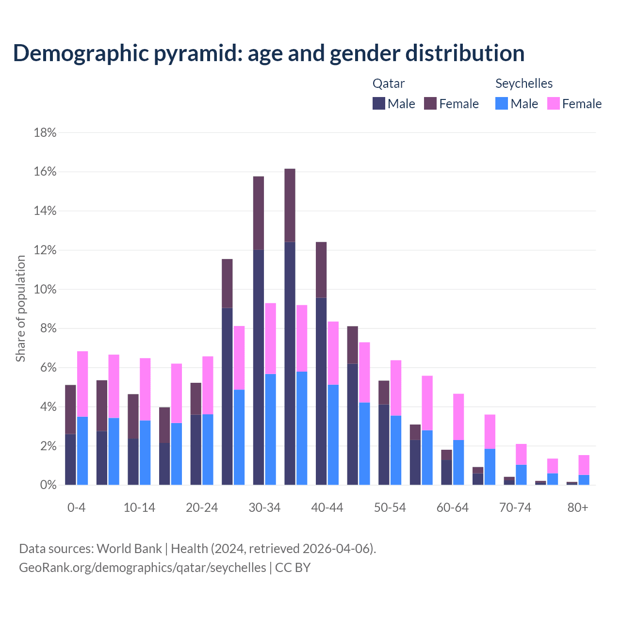 - As of 2026, the population of Qatar is 3M vs 126K in the Seychelles - 23.7 times difference.