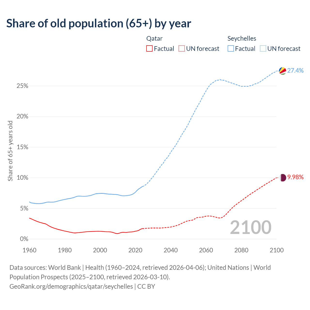 The share of older people aged 65 and over is 1.68% in Qatar and 8.54% in the Seychelles. Life expectancy in Qatar compared to the Seychelles .