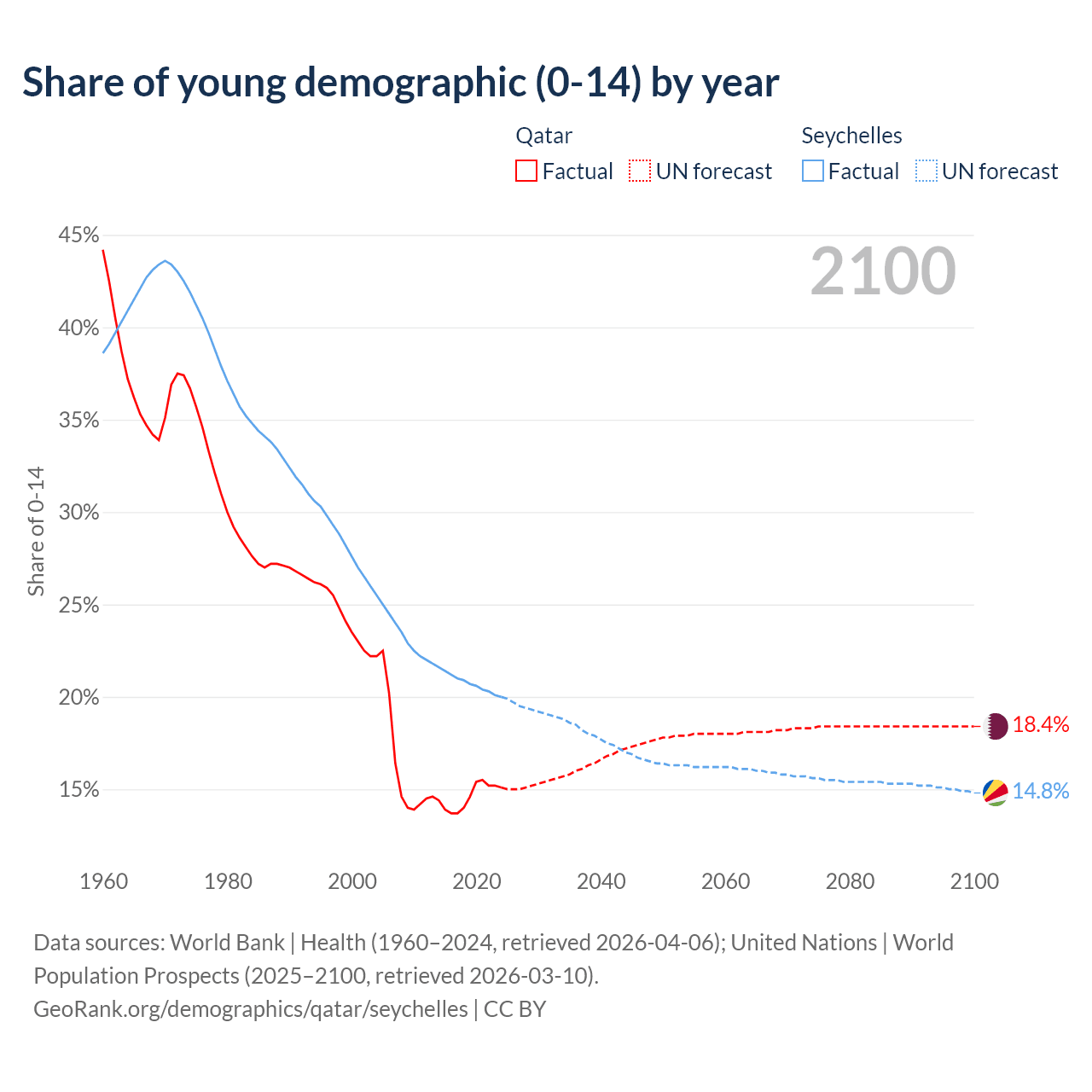 - The share of young demographic (0-15 years old) in Qatar is 15.1% vs 20% in the Seychelles.