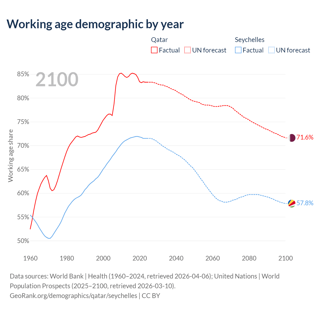 - Qatar has 2.5M working age adults (aged 15-64) vs 90.3K in the Seychelles.