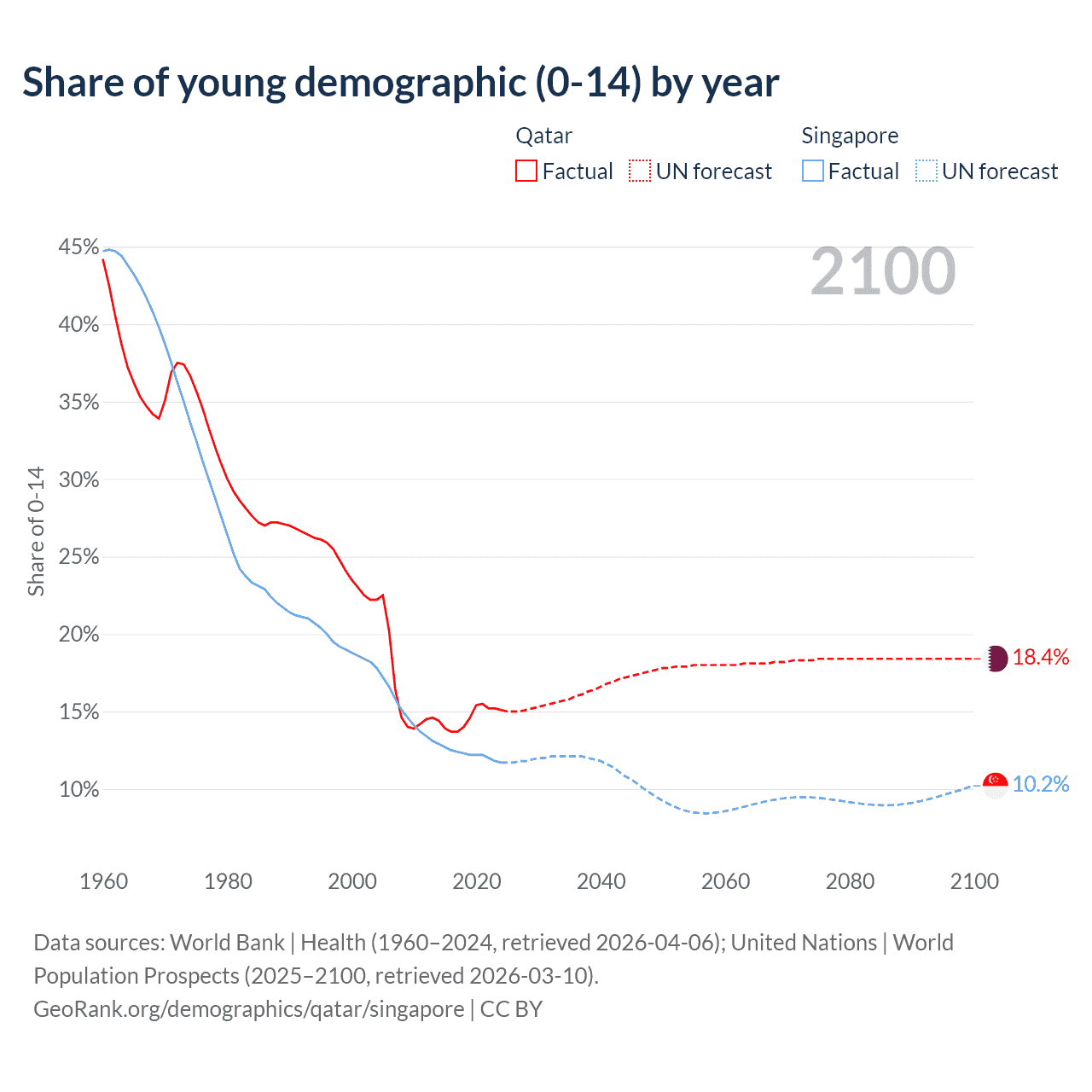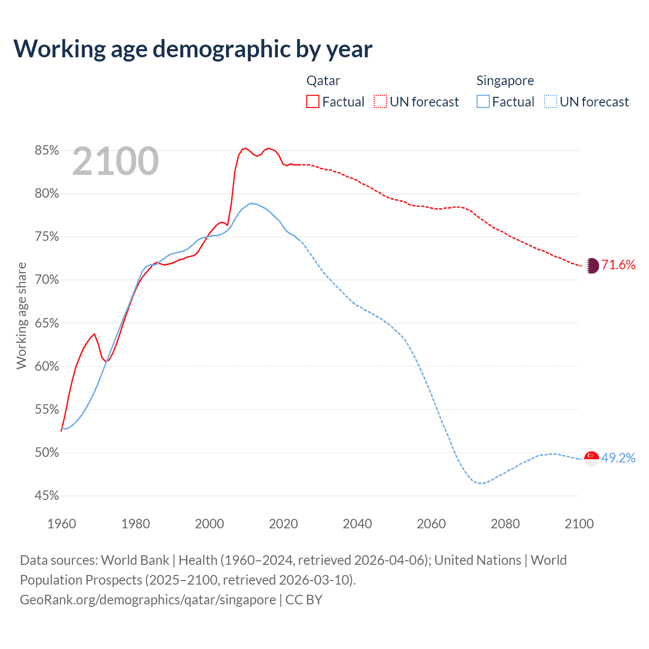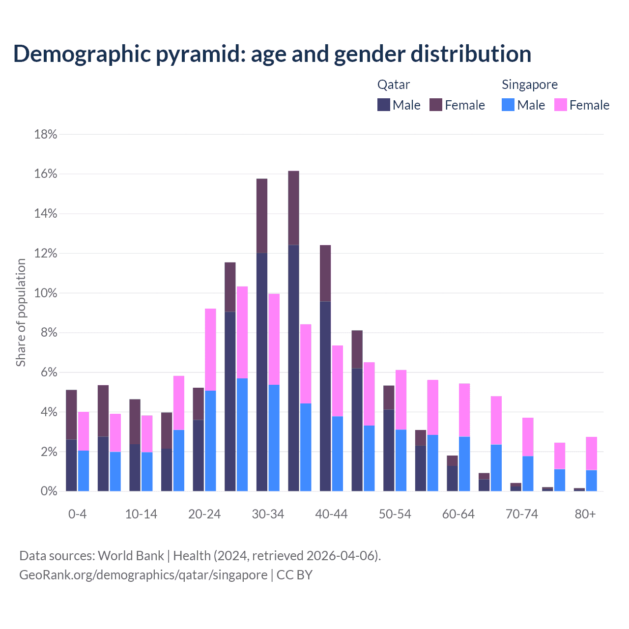 - Qatar is ranked 78/196 by median age (oldest to youngest) vs 68/196 for Singapore.