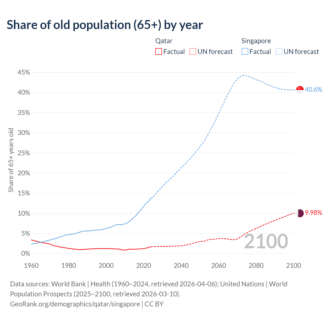 The share of older people aged 65 and over is 1.68% in Qatar and 13.7% in Singapore. Life expectancy in Qatar compared to Singapore .
