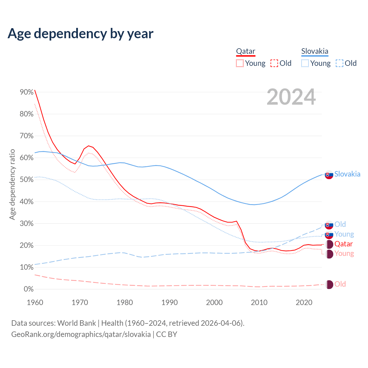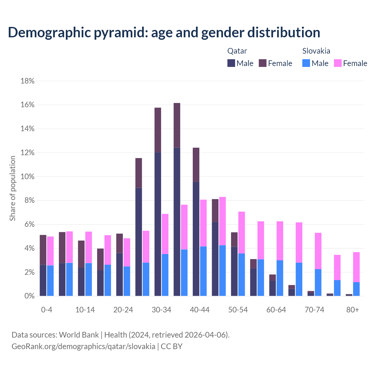 - Qatar is ranked 78/196 by median age (oldest to youngest) vs 31/196 for Slovakia.
