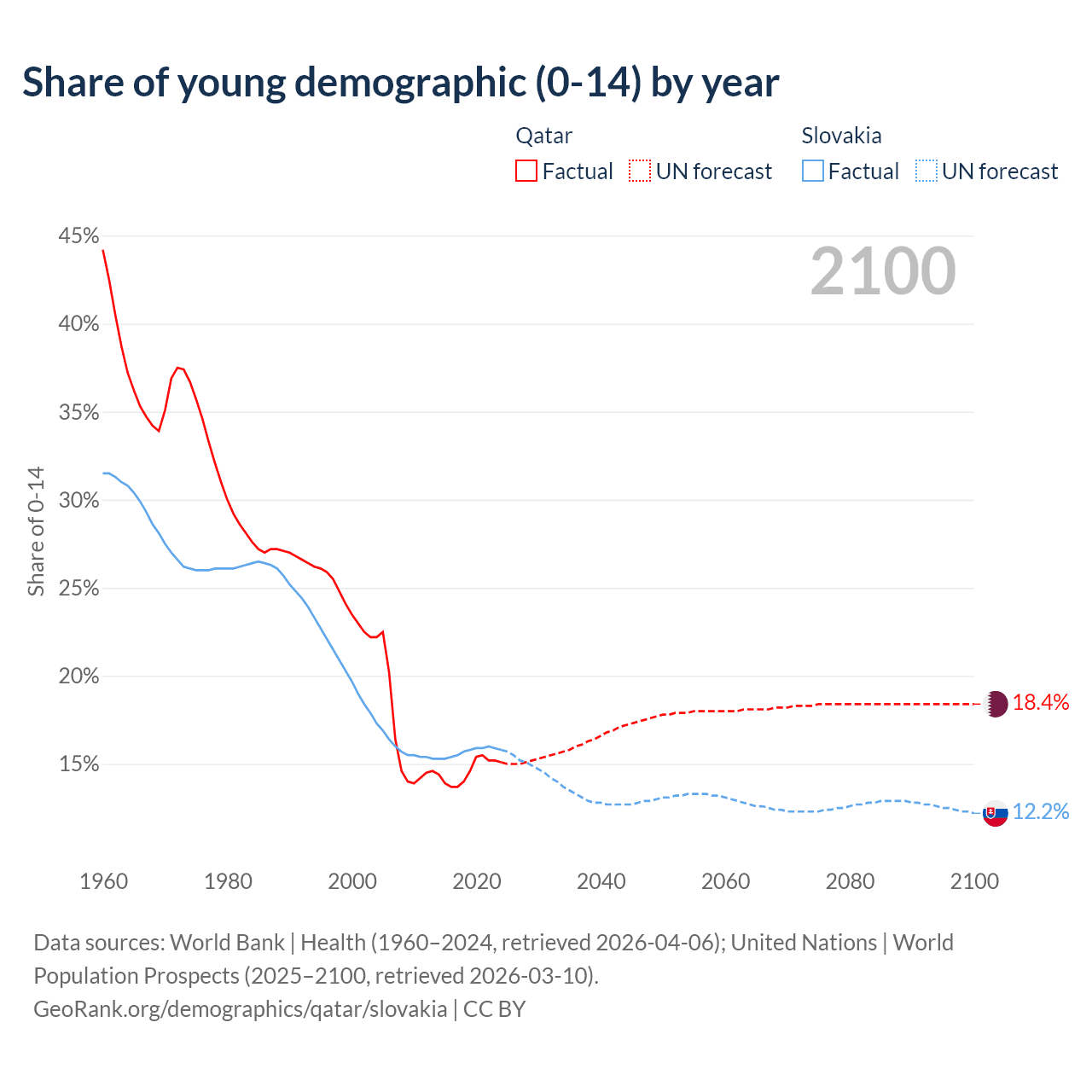 - The share of young demographic (0-15 years old) in Qatar is 15.1% vs 15.8% in Slovakia.