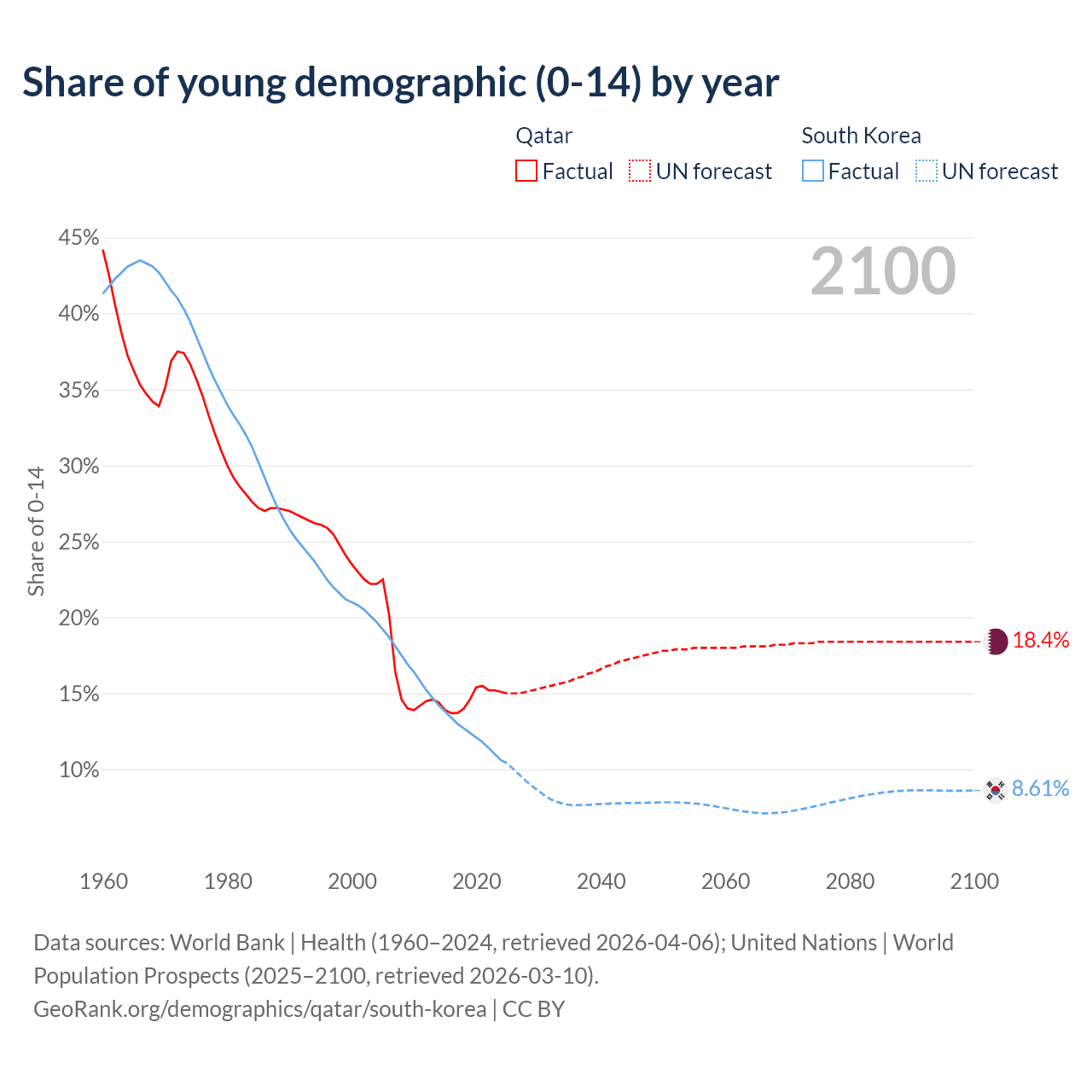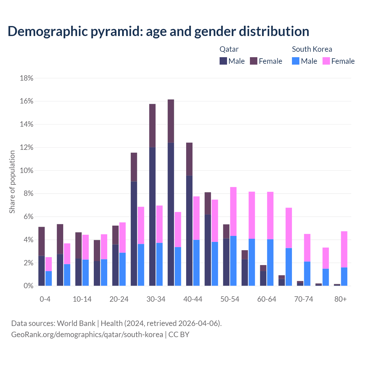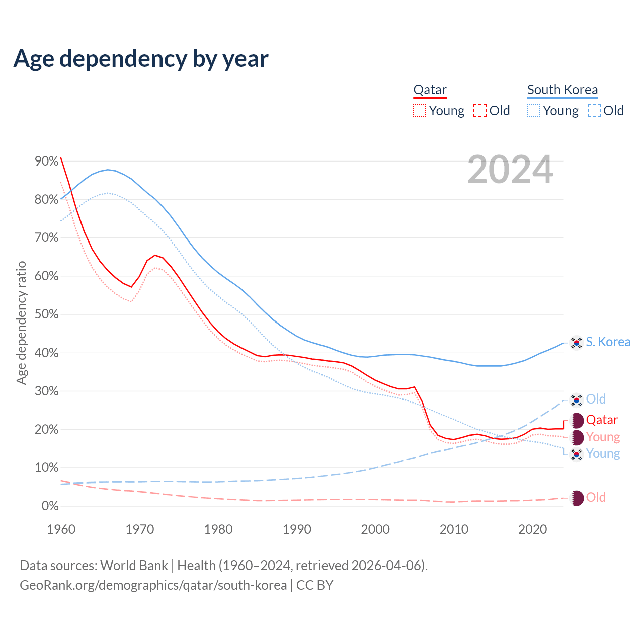 - Qatar is ranked 78/196 by median age (oldest to youngest) vs 10/196 for South Korea.