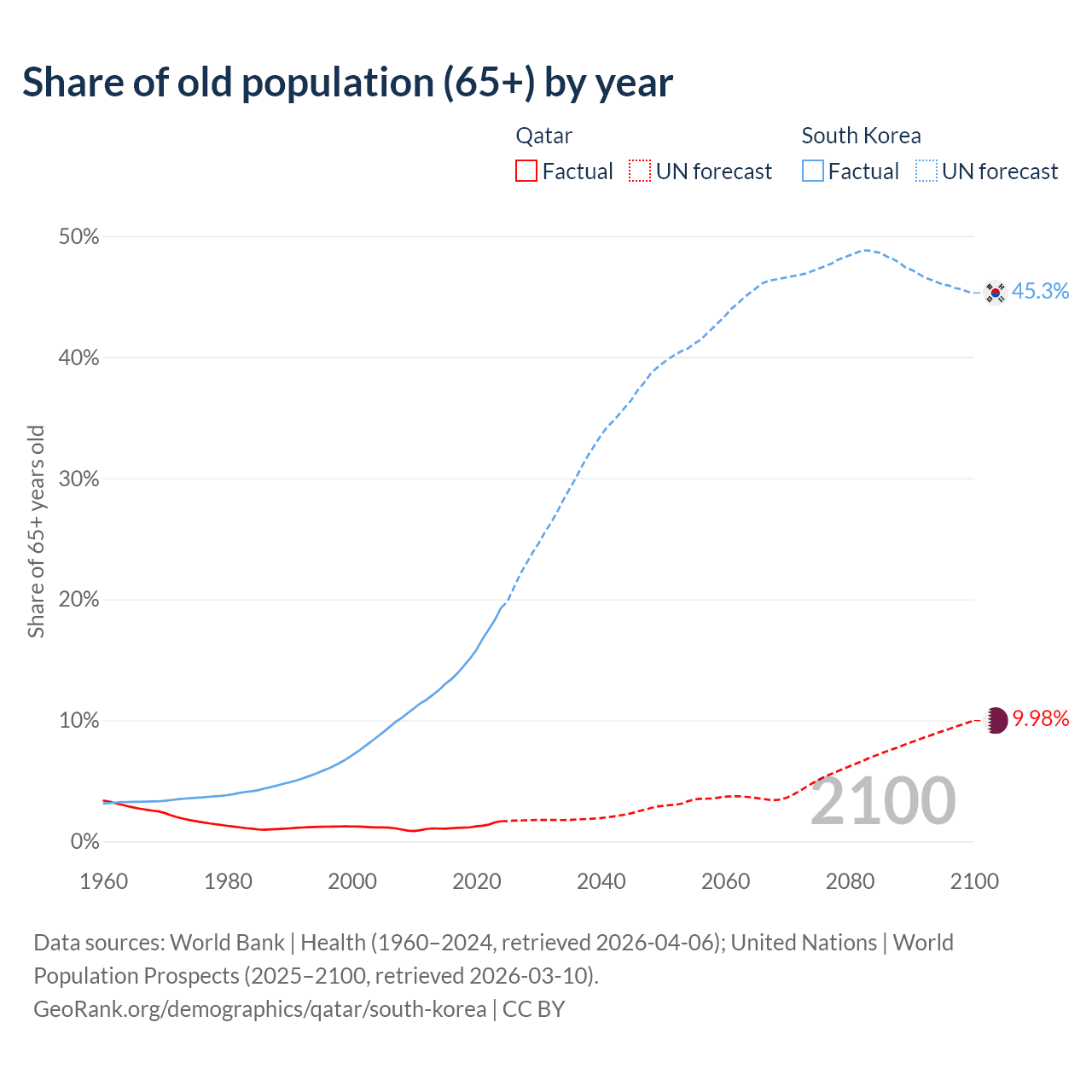 The share of older people aged 65 and over is 1.68% in Qatar and 19.3% in South Korea. Life expectancy in Qatar compared to South Korea .