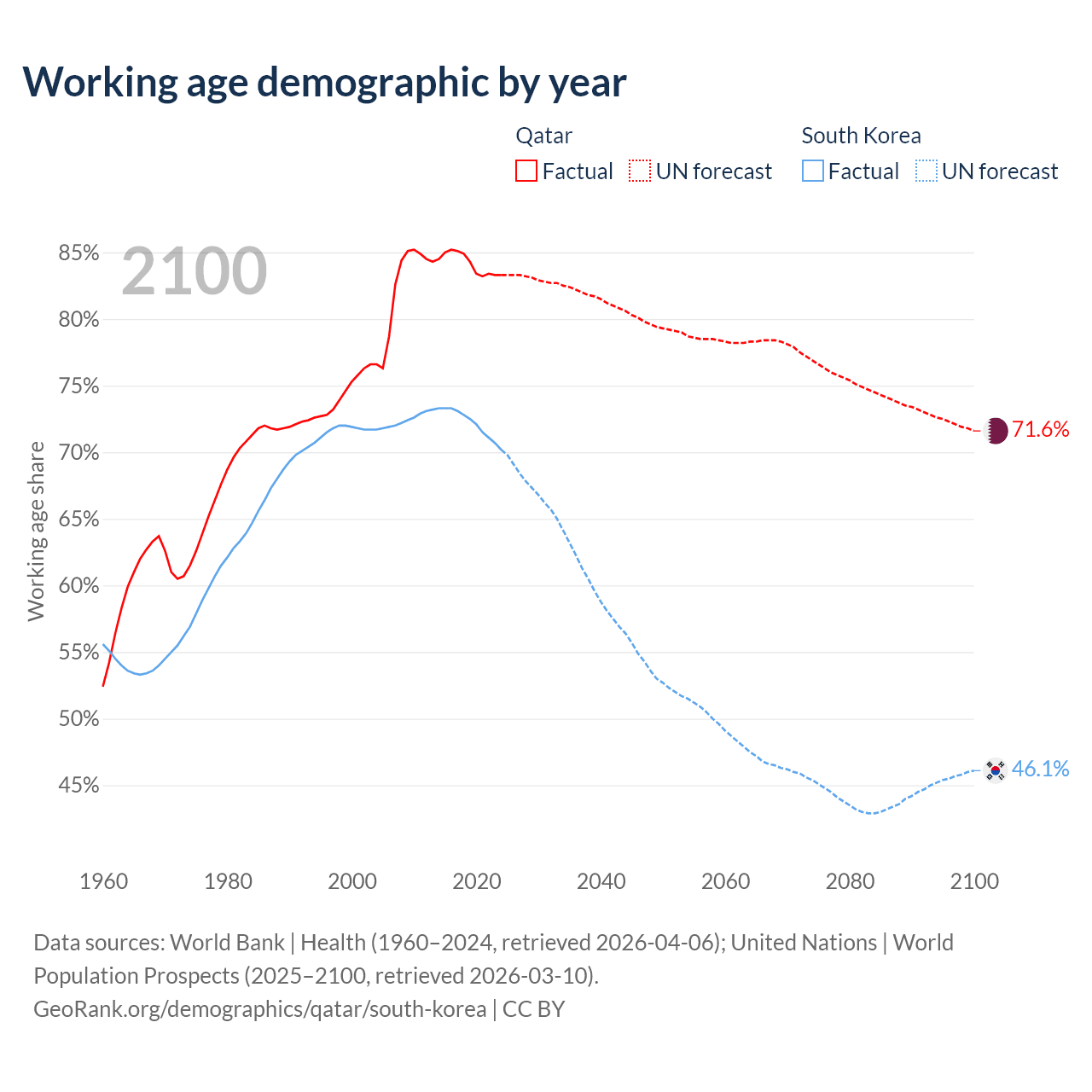 - Qatar has 2.5M working age adults (aged 15-64) vs 36.2M in South Korea.