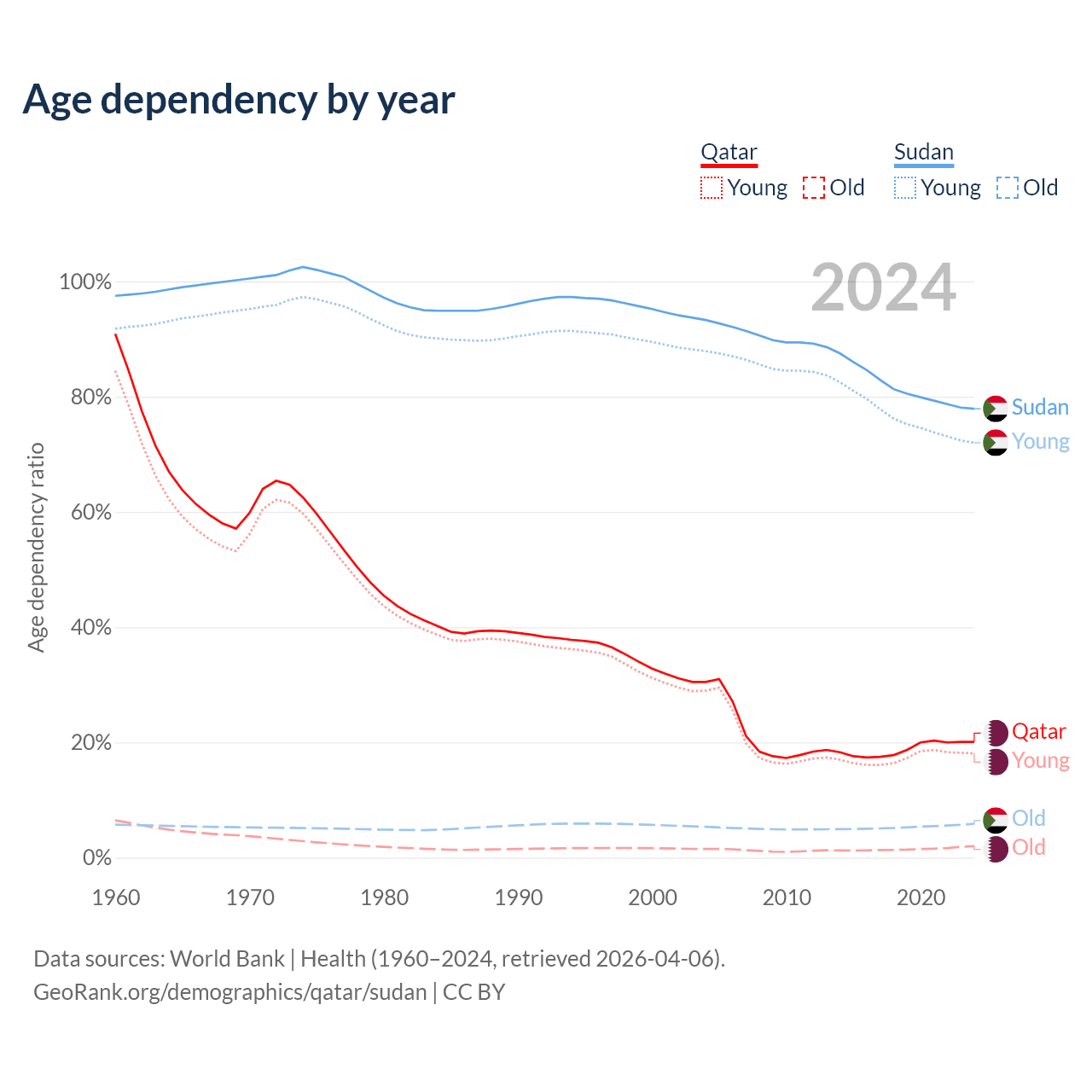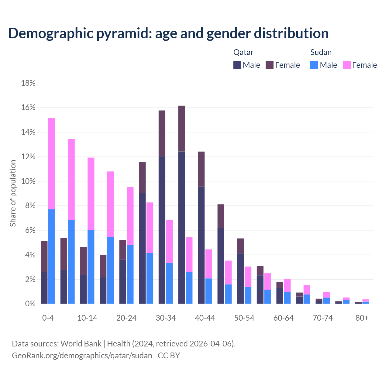 - Qatar is ranked 78/196 by median age (oldest to youngest) vs 172/196 for Sudan.