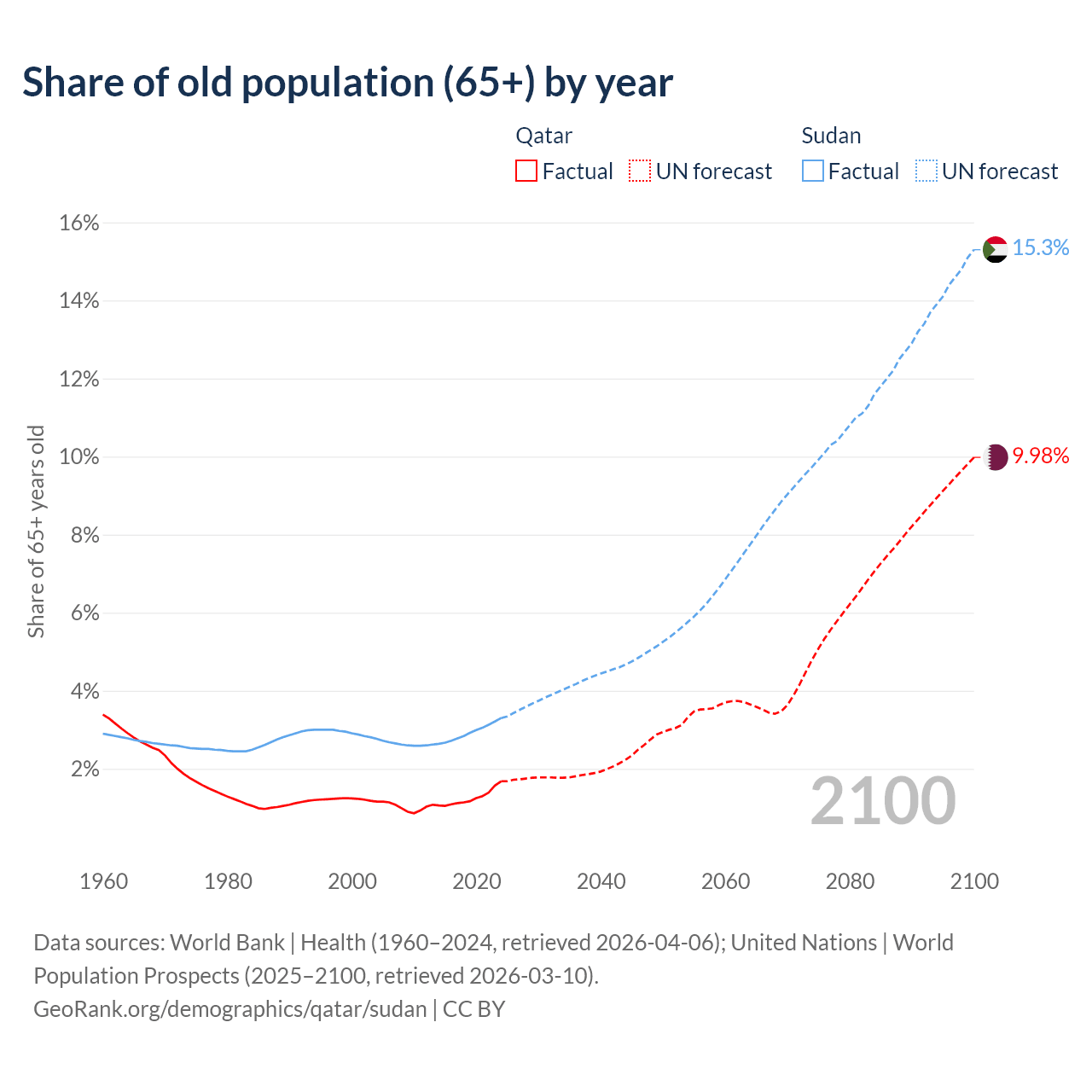 The share of older people aged 65 and over is 1.68% in Qatar and 3.3% in Sudan. Life expectancy in Qatar compared to Sudan .