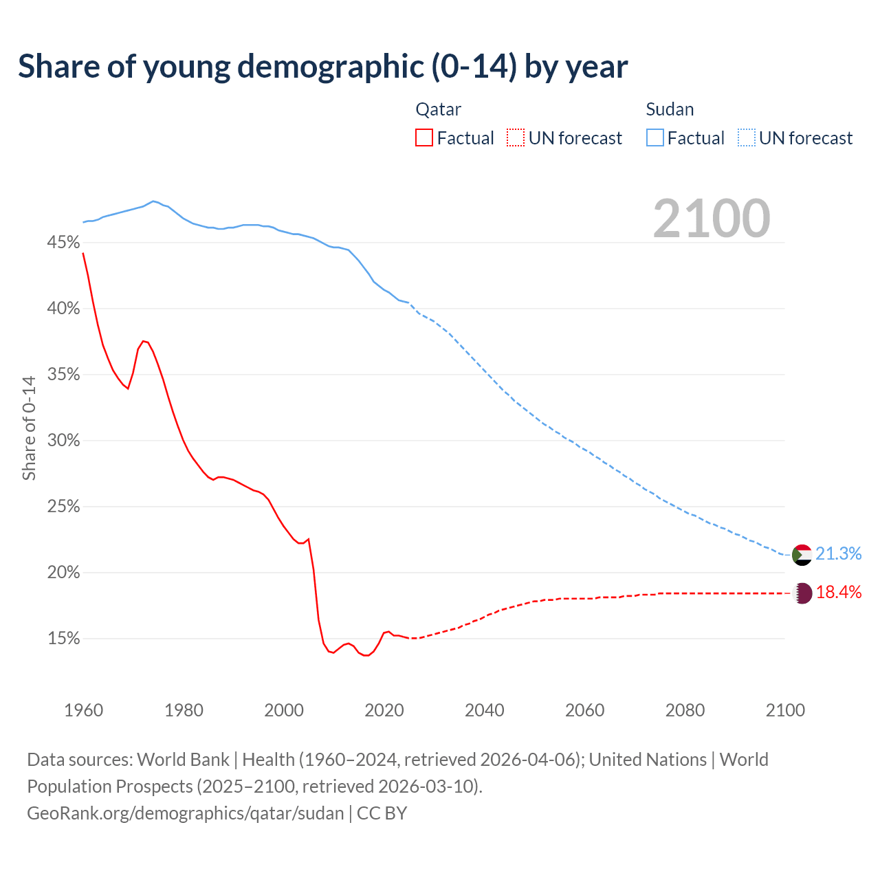 - The share of young demographic (0-15 years old) in Qatar is 15.1% vs 40.5% in Sudan.