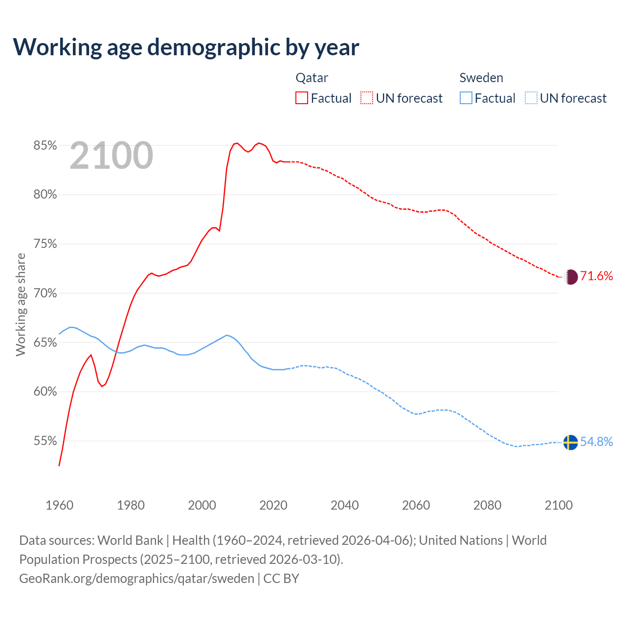 - Qatar has 2.5M working age adults (aged 15-64) vs 6.65M in Sweden.