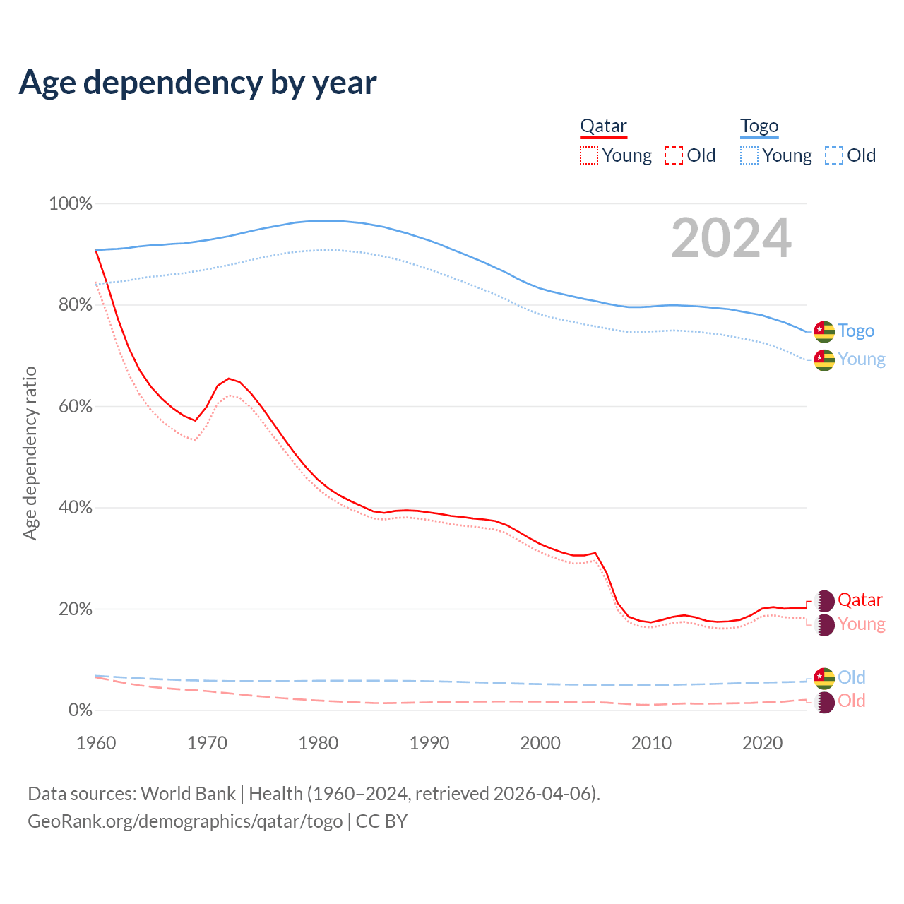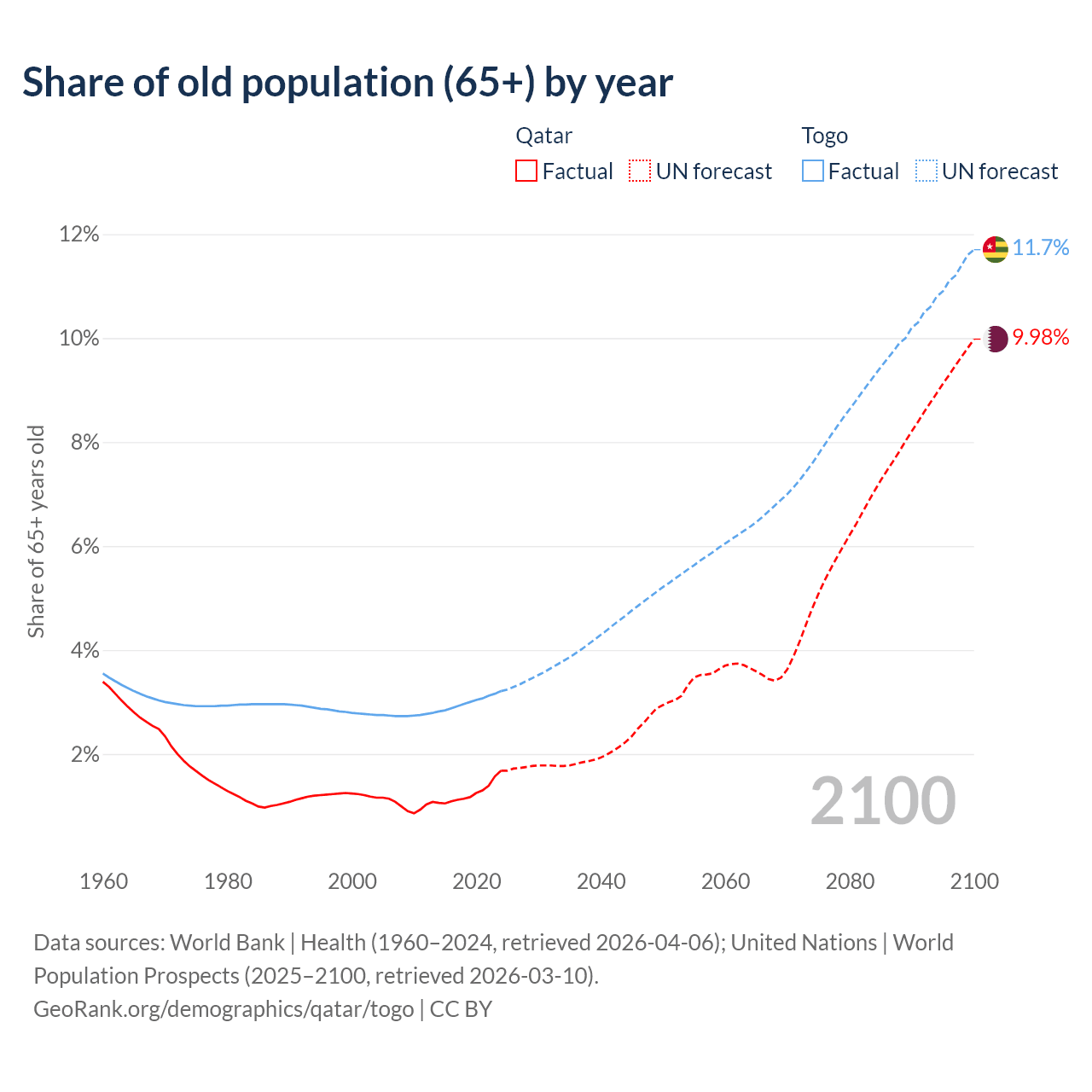 The share of older people aged 65 and over is 1.68% in Qatar and 3.21% in Togo. Life expectancy in Qatar compared to Togo .