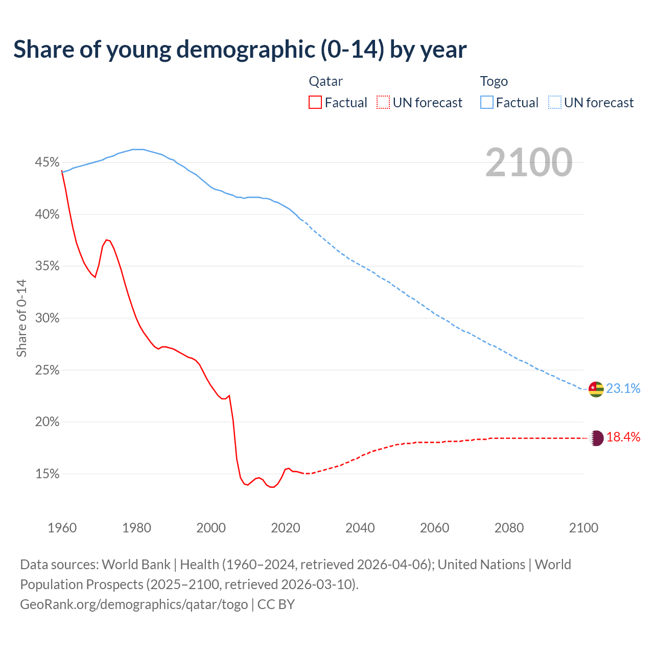 - The share of young demographic (0-15 years old) in Qatar is 15.1% vs 39.5% in Togo.