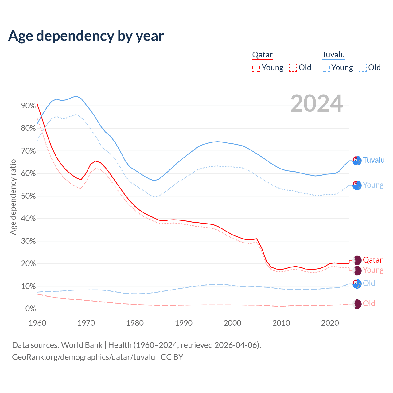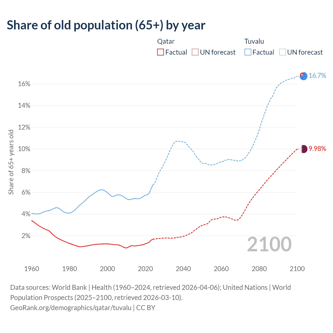 - The share of old-age demographic (65+) in Qatar is 1.68% vs 6.67% in Tuvalu.