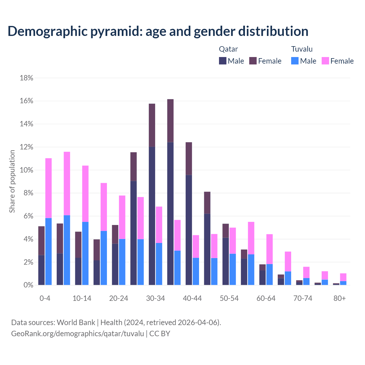 - Qatar is ranked 78/196 by median age (oldest to youngest) vs 132/196 for Tuvalu.