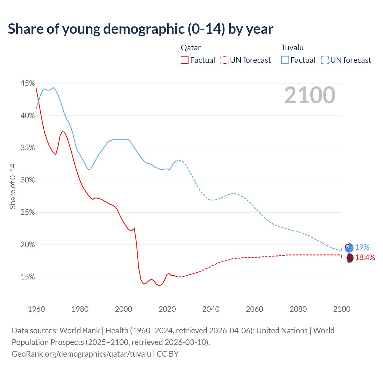 - The share of young demographic (0-15 years old) in Qatar is 15.1% vs 32.9% in Tuvalu.