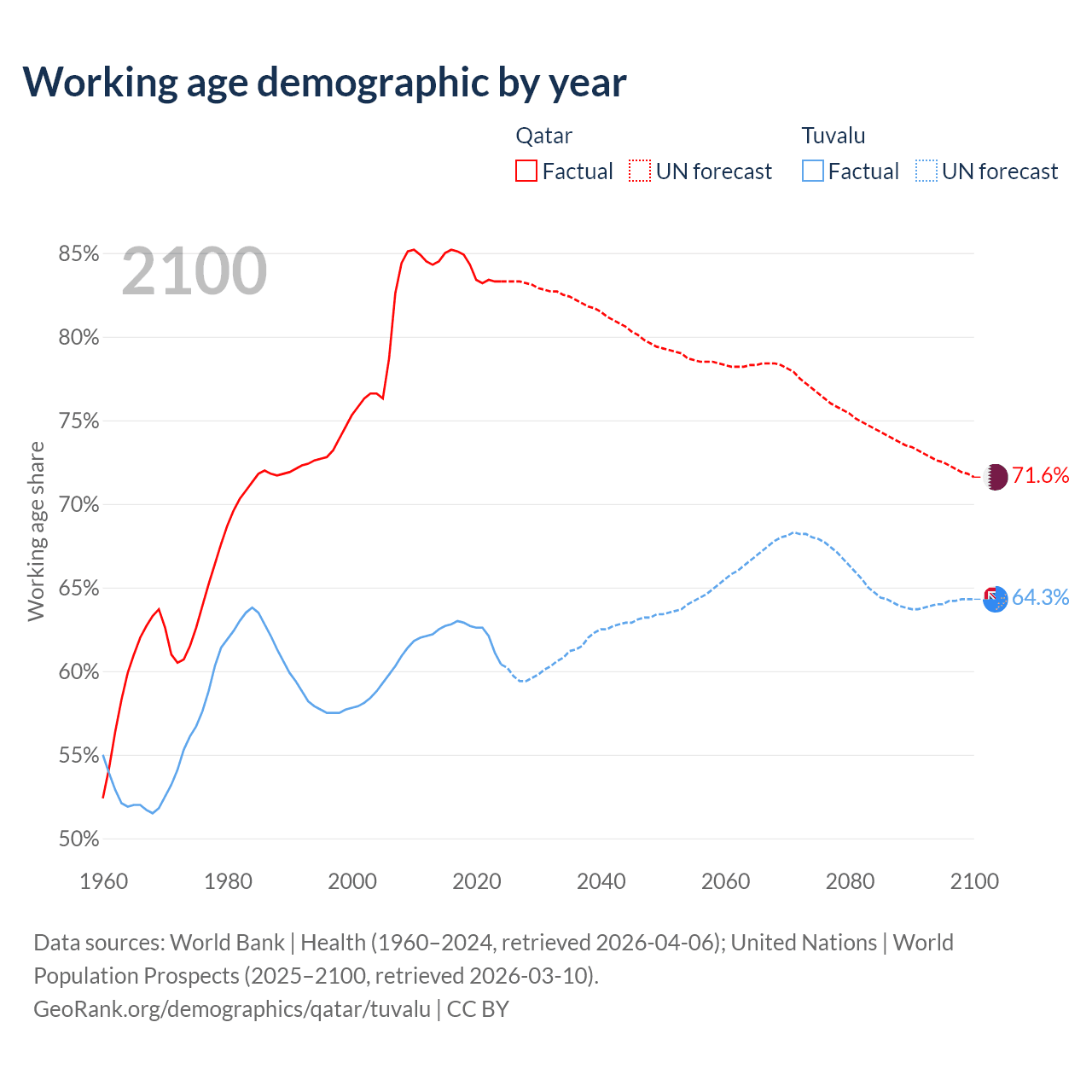 - Qatar has 2.5M working age adults (aged 15-64) vs 5.64K in Tuvalu.