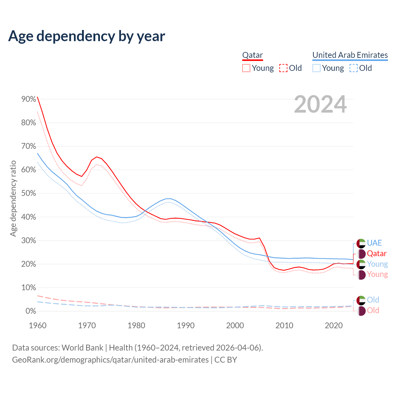 Data sources: World Bank | Health (1960–2024, retrieved 2026-04-06); U.S. Census Bureau (1960–2024, retrieved 2026-02-08).