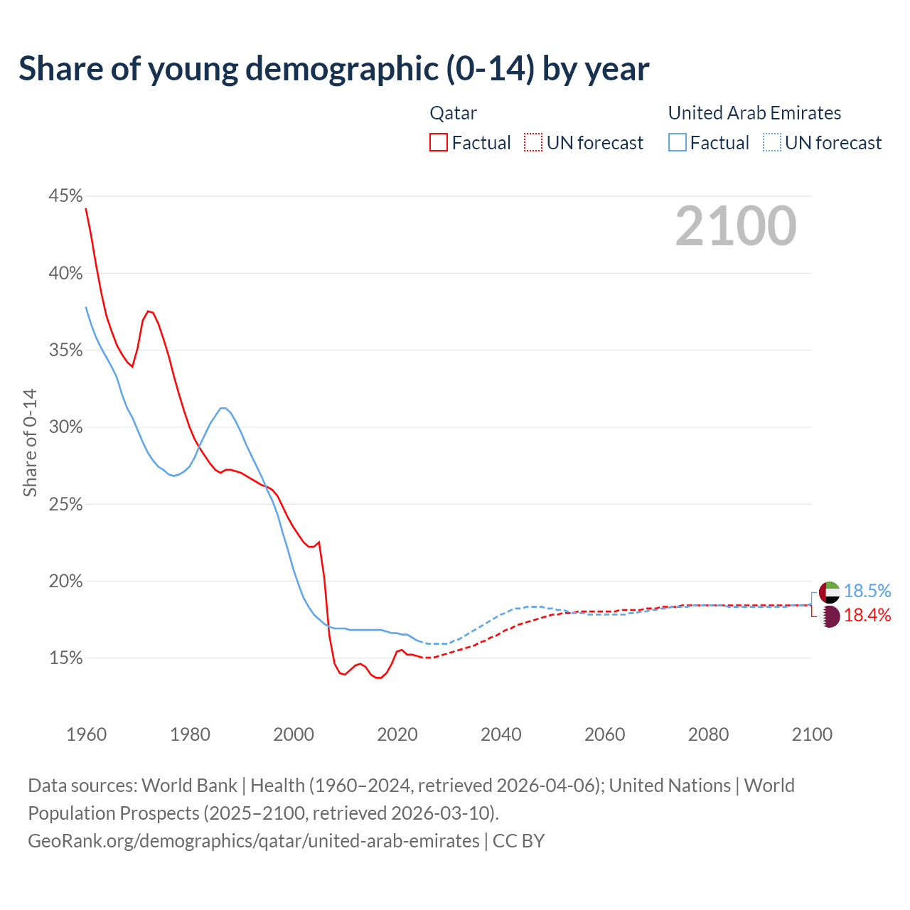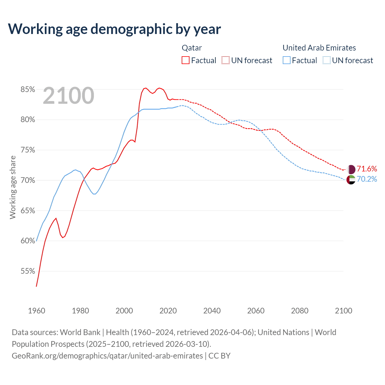 Median age Qatar vs United Arab Emirates, 1960-2100