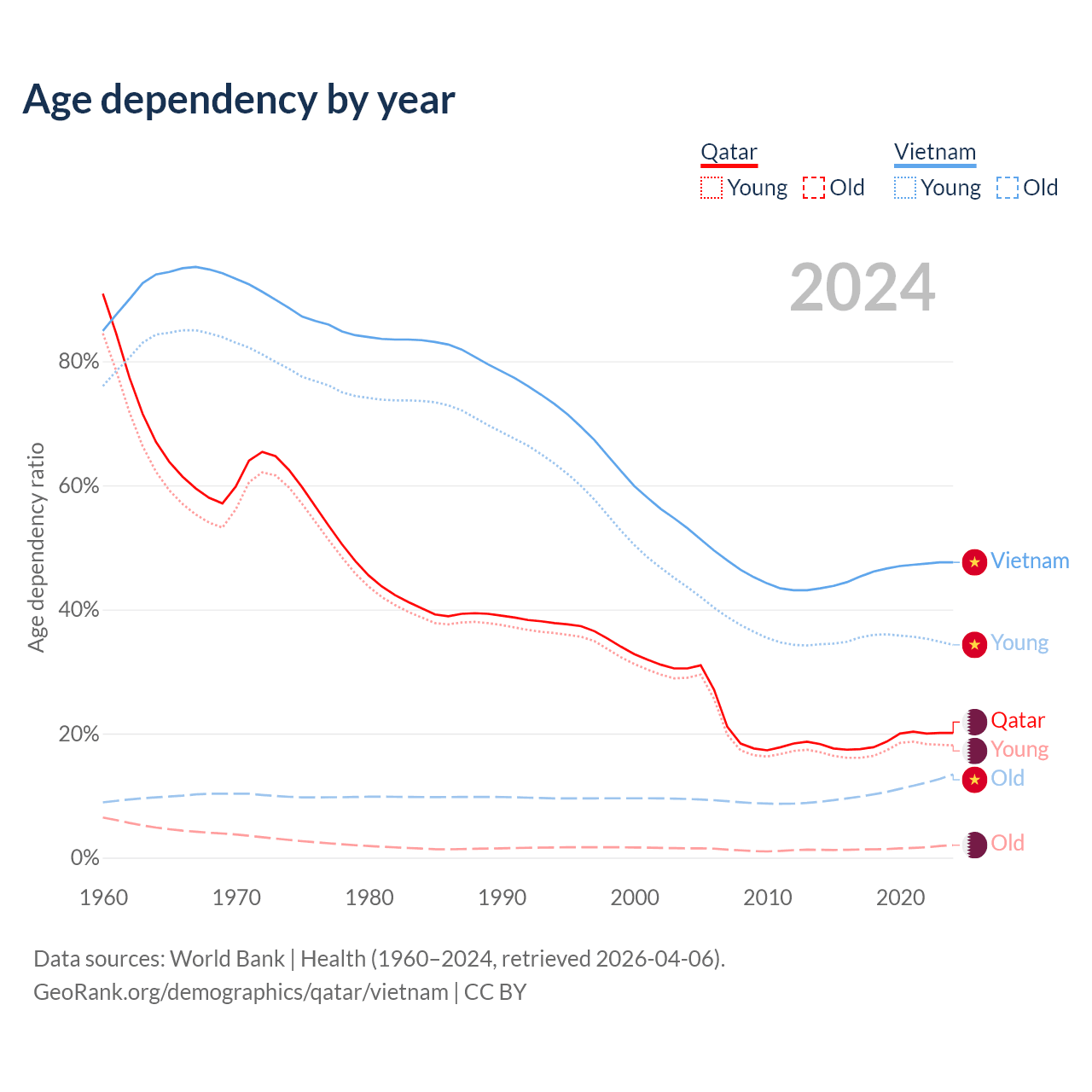 Data sources: World Bank | Health (1960–2024, retrieved 2026-04-06); U.S. Census Bureau (1960–2024, retrieved 2026-02-08).