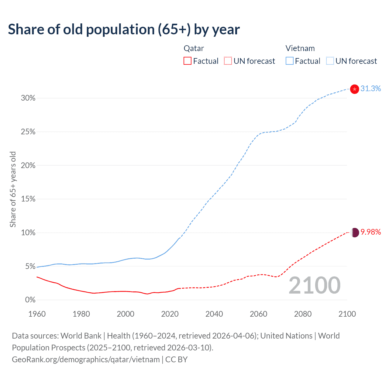 The share of older people aged 65 and over is 1.68% in Qatar and 9.05% in Vietnam. Life expectancy in Qatar compared to Vietnam .