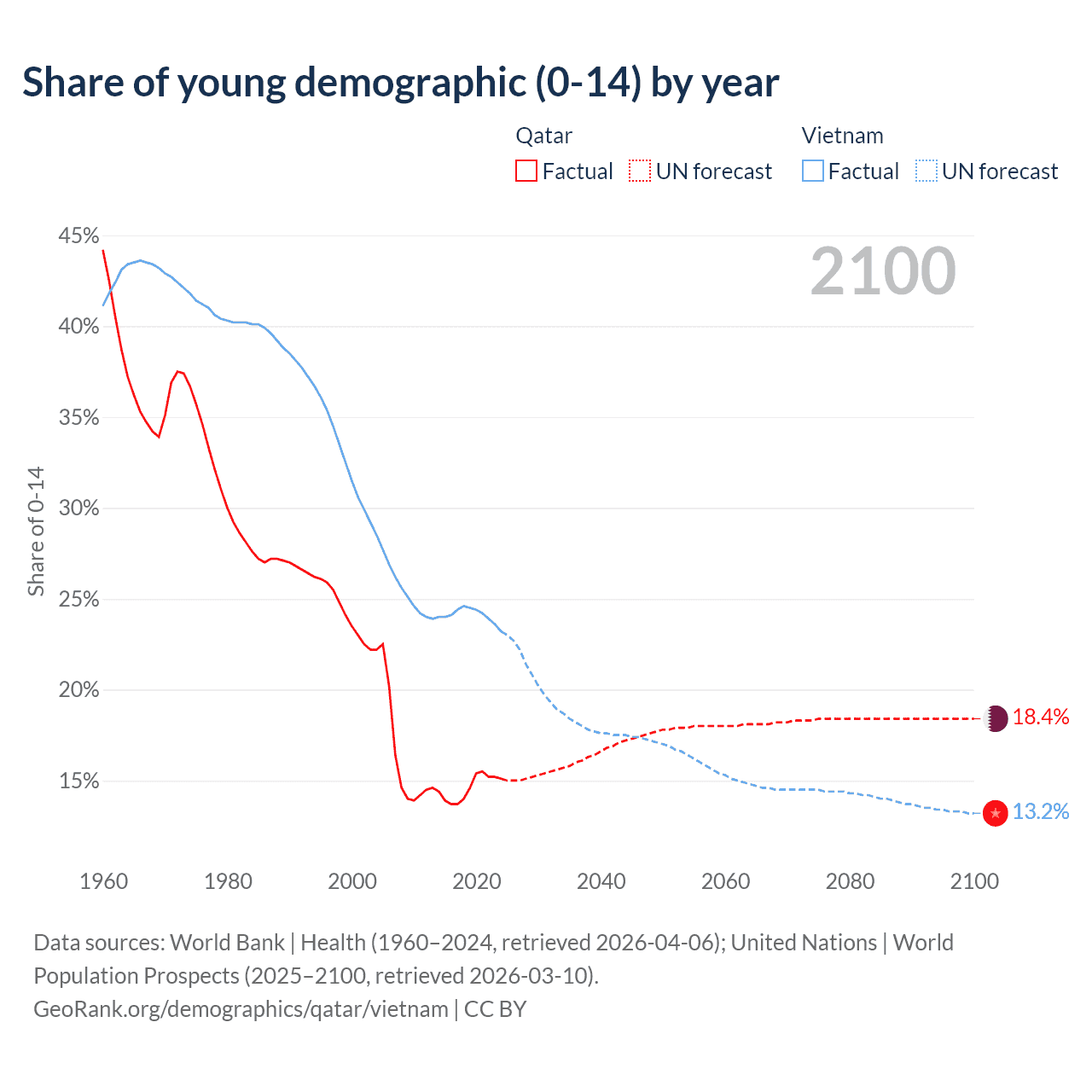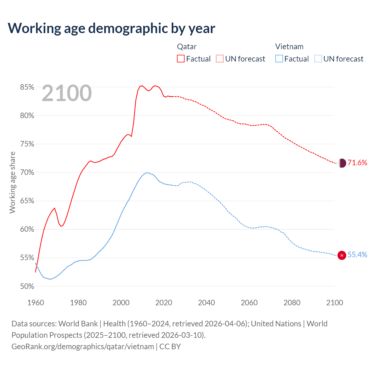 Median age Qatar vs Vietnam, 1960-2100