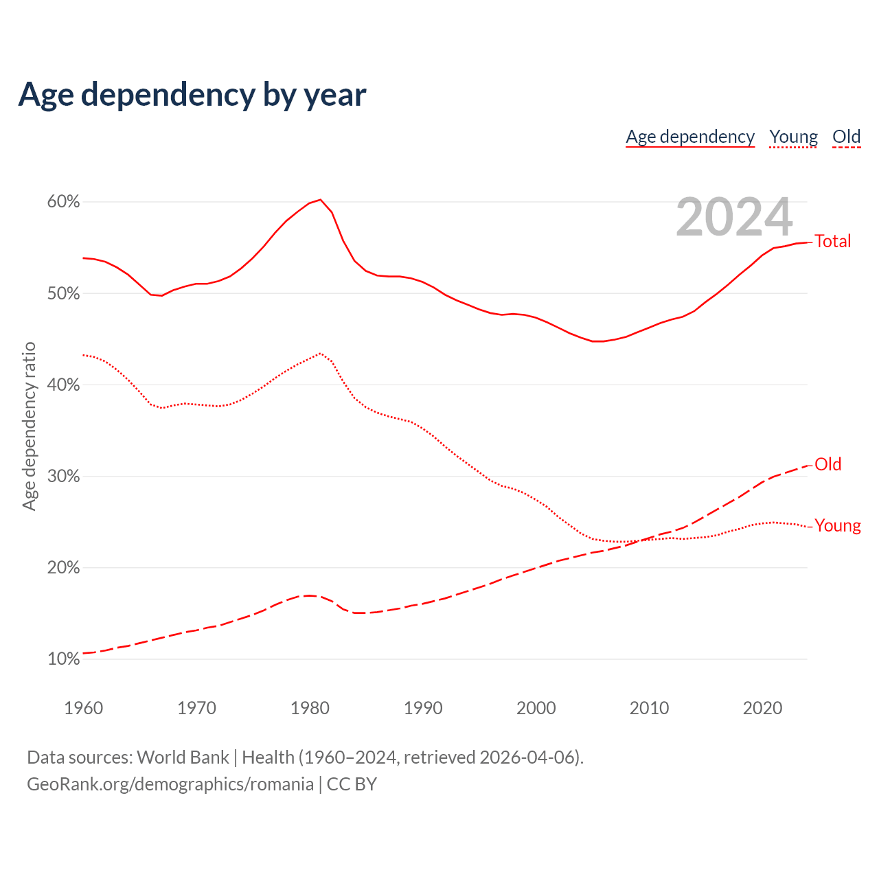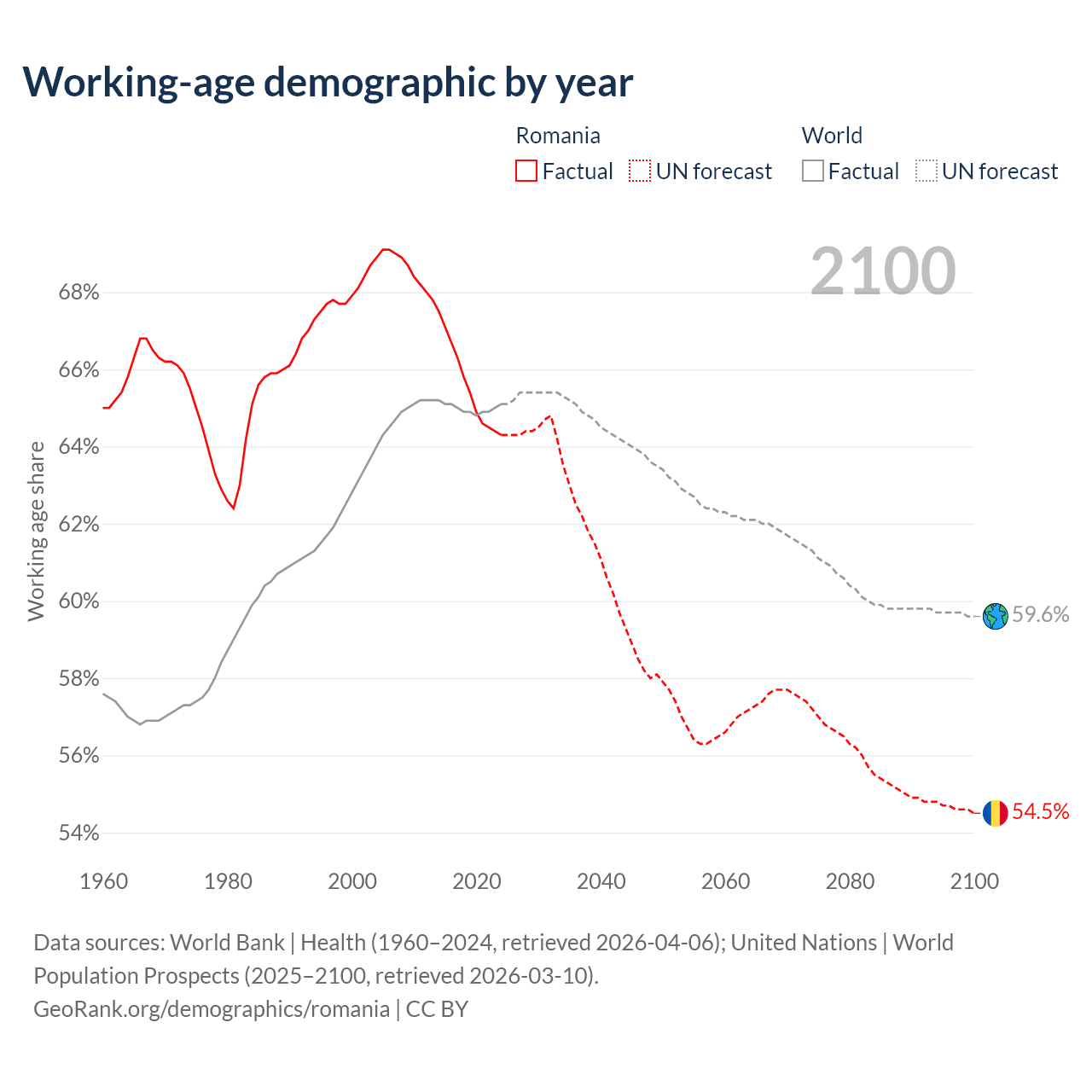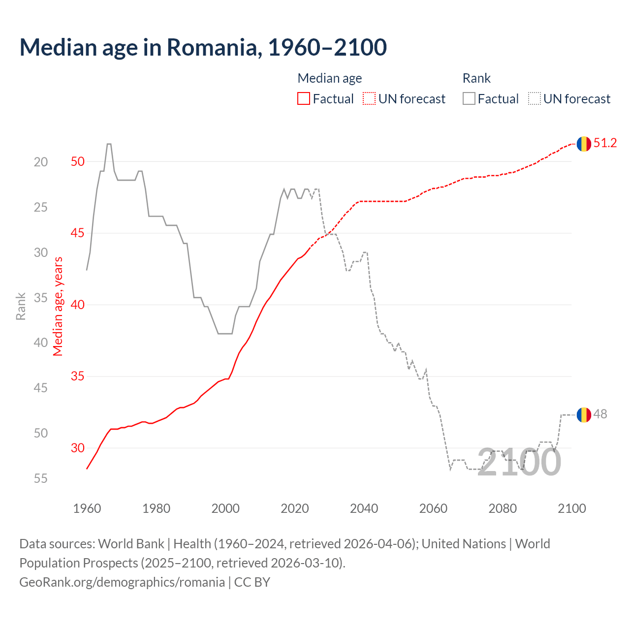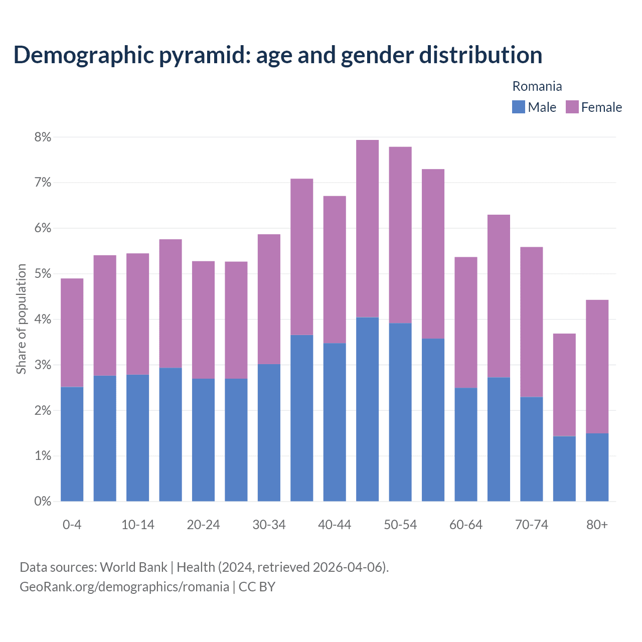 With a population of 19.1M people, Romania has a median age of 43.8 years which makes it the 23/196 oldest country. 15.7% of the demographic are children 0-14 years old, 64.3% are working-age people aged 15-64, and 20% are older population aged 65+ years.