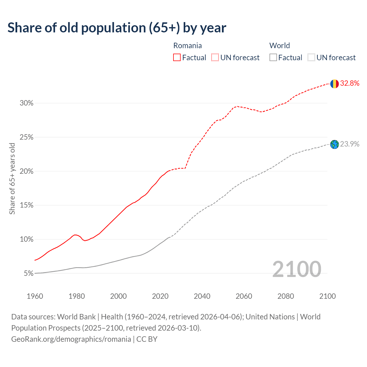 The share of older people aged 65 and over in Romania increased from 14.7% to 20% between 2004 and 2024.
