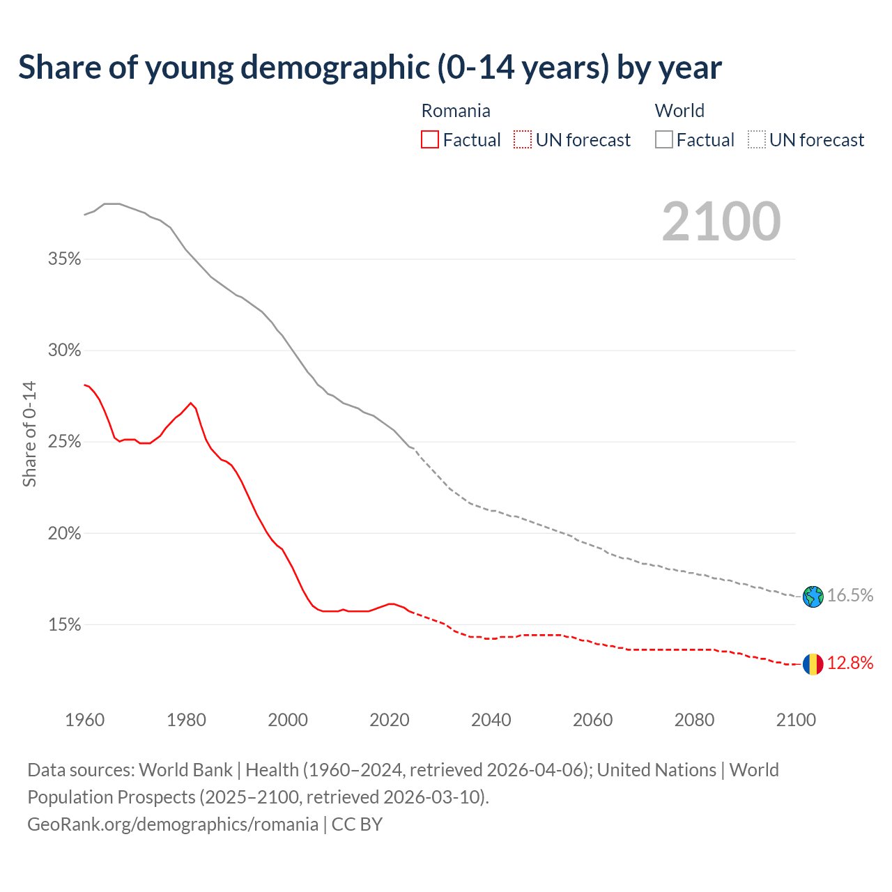 The share of children aged 0-14 in Romania decreased from 16.4% to 15.7% between 2004 and 2024 due to changes in birth rates.