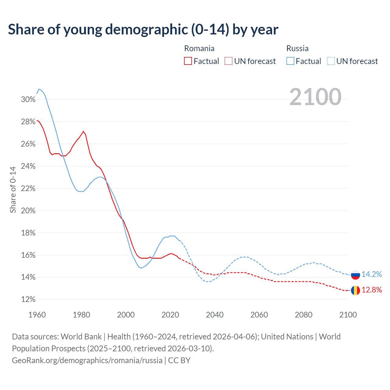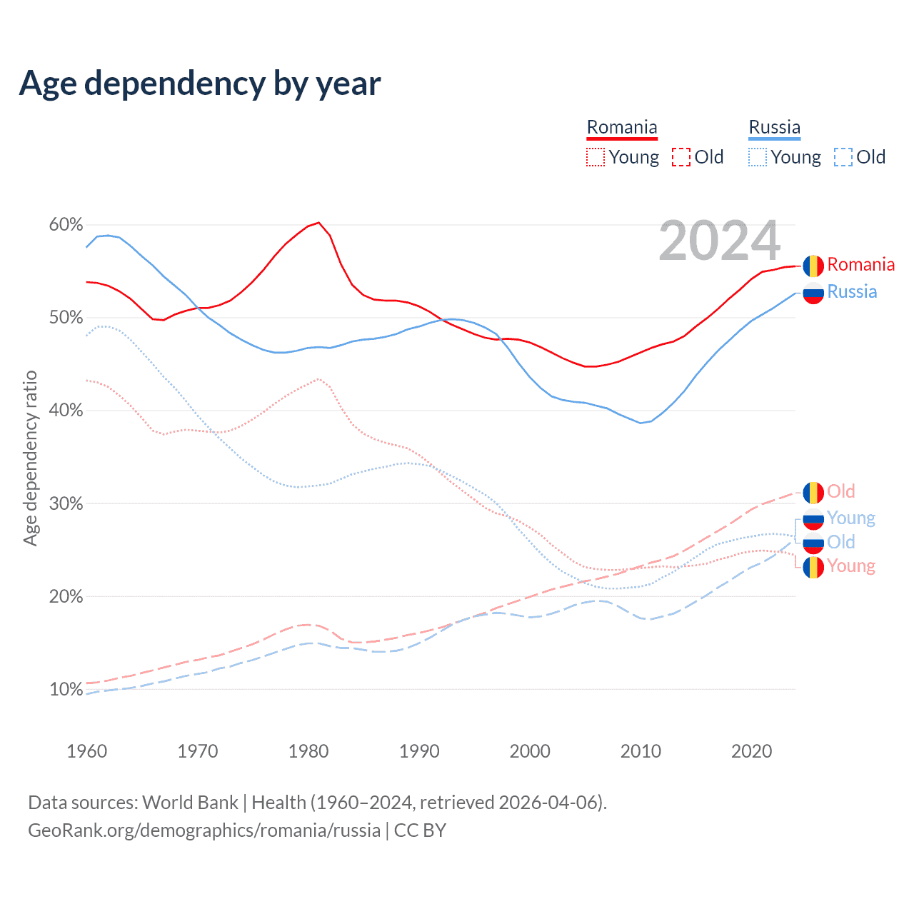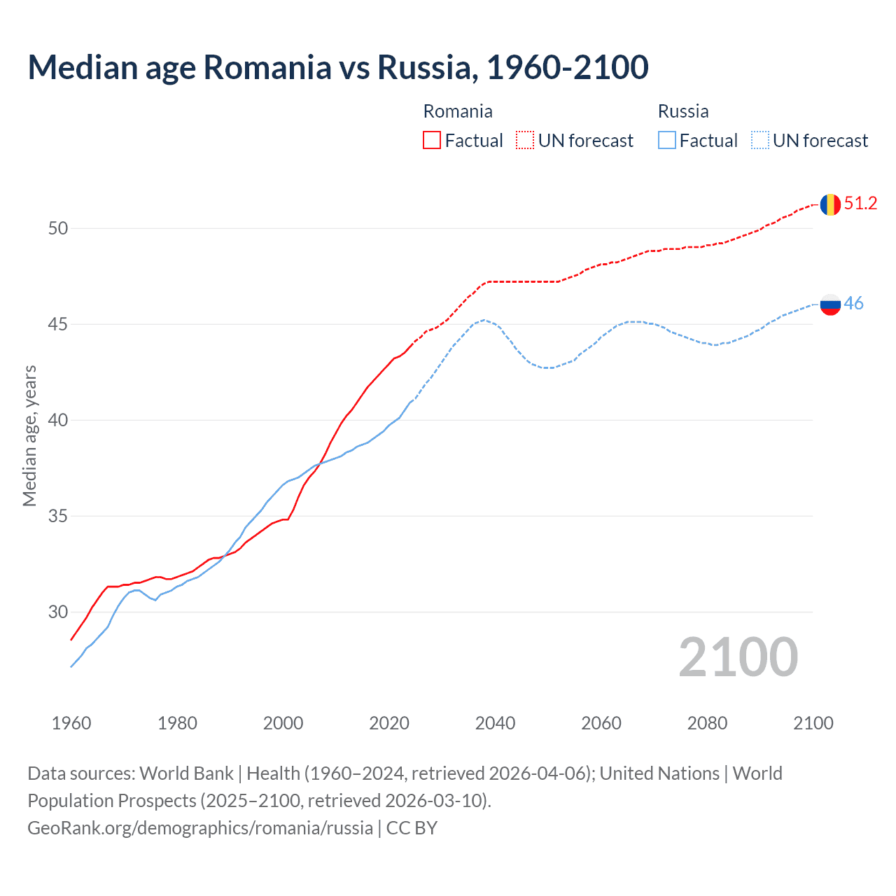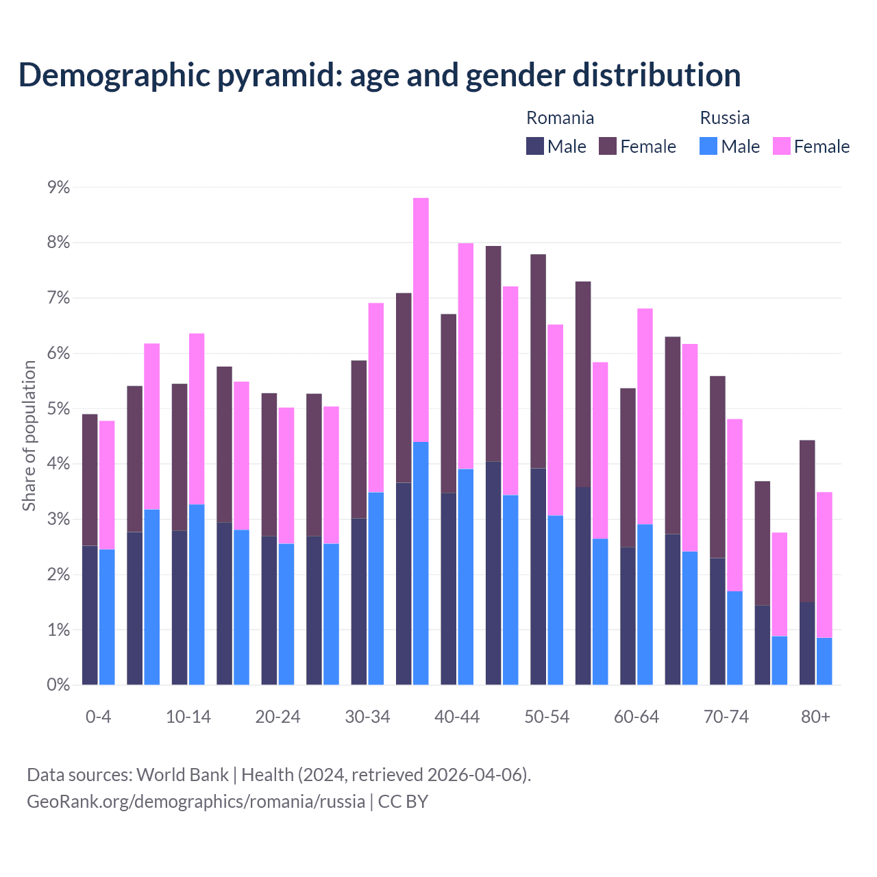 - Romania is ranked 23/196 by median age (oldest to youngest) vs 42/196 for Russia.