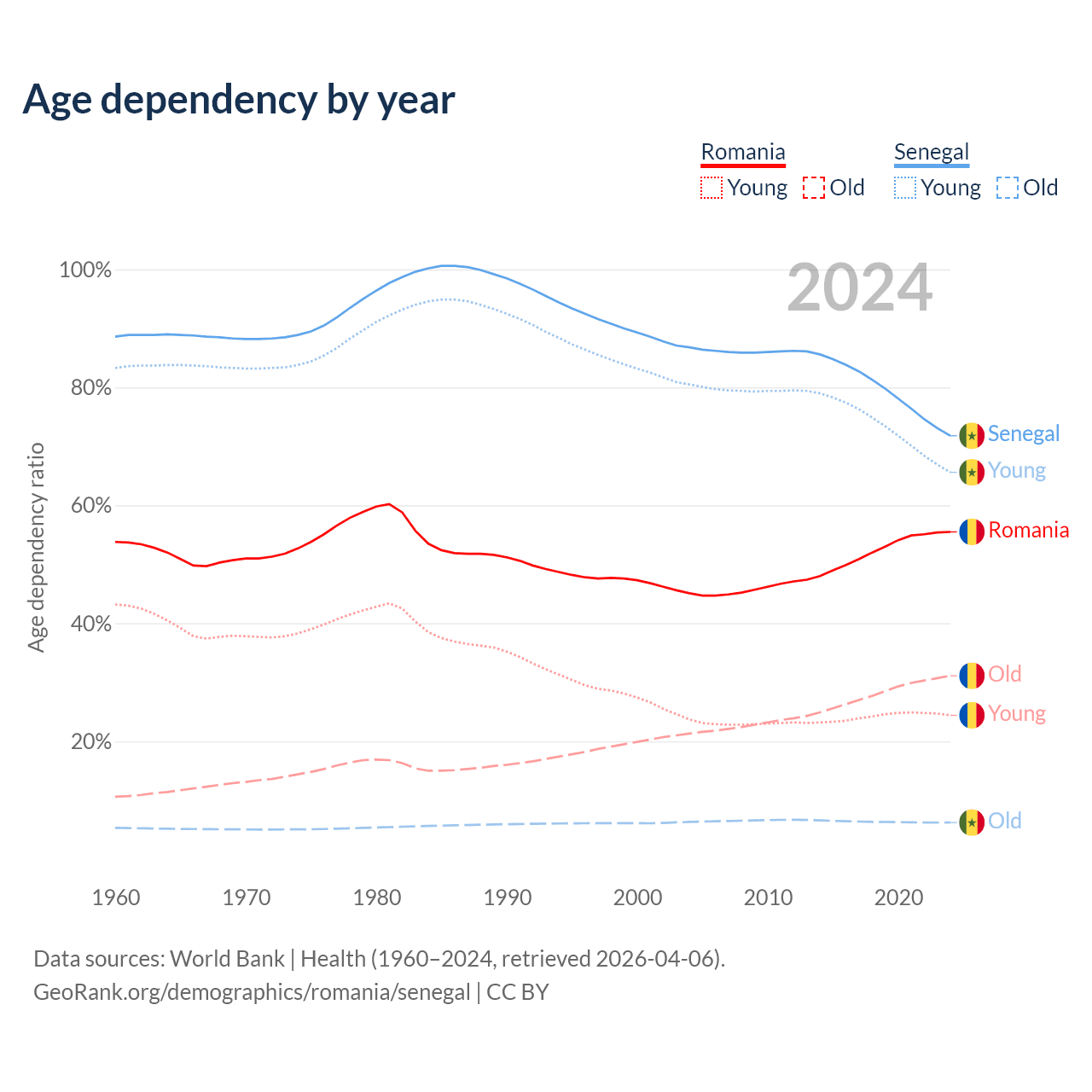 The share of older people aged 65 and over is 20% in Romania and 3.62% in Senegal. Life expectancy in Romania compared to Senegal .