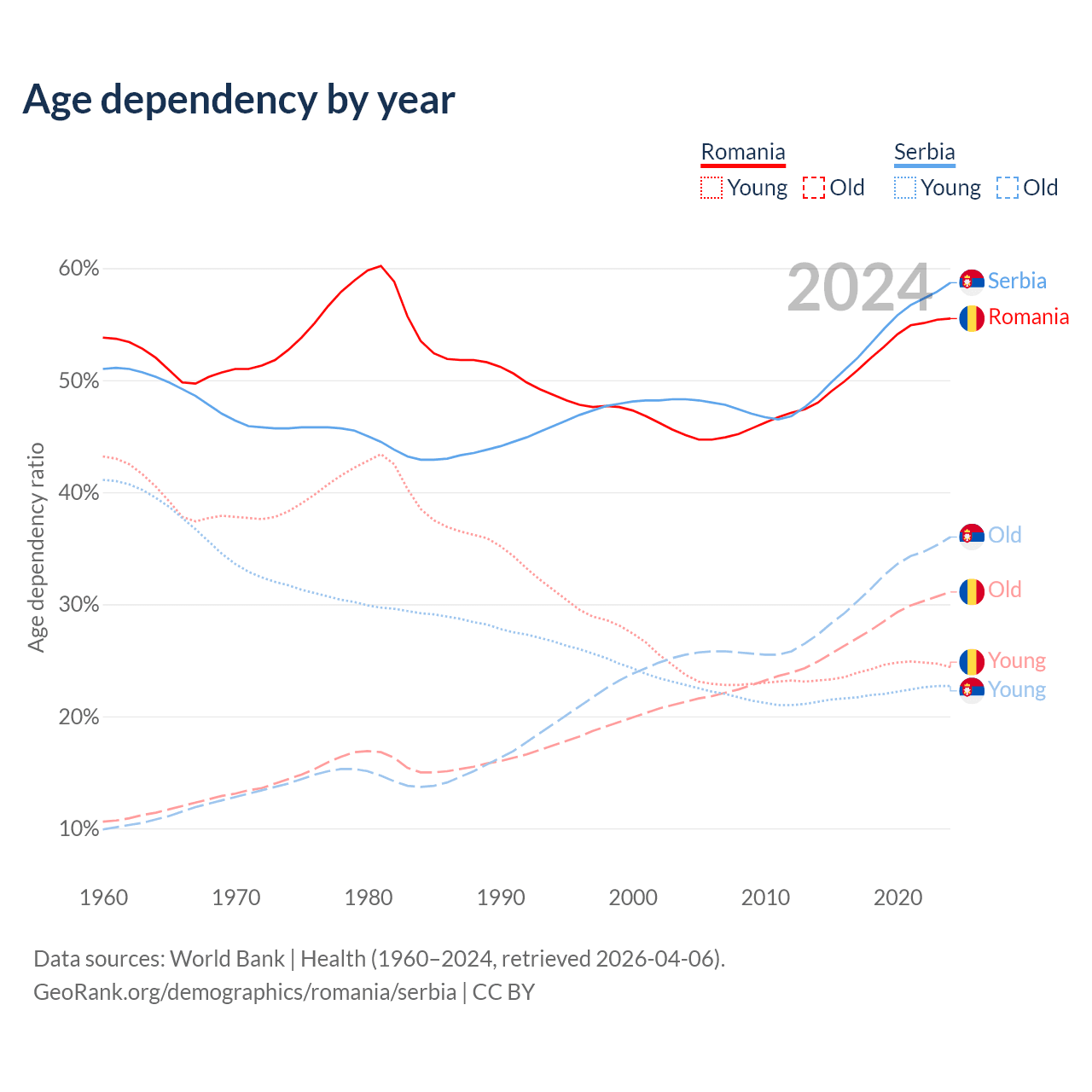 - Romania is ranked 23/196 by median age (oldest to youngest) vs 15/196 for Serbia.