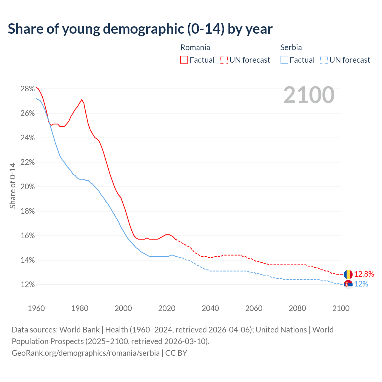 Median age Romania vs Serbia, 1960-2100
